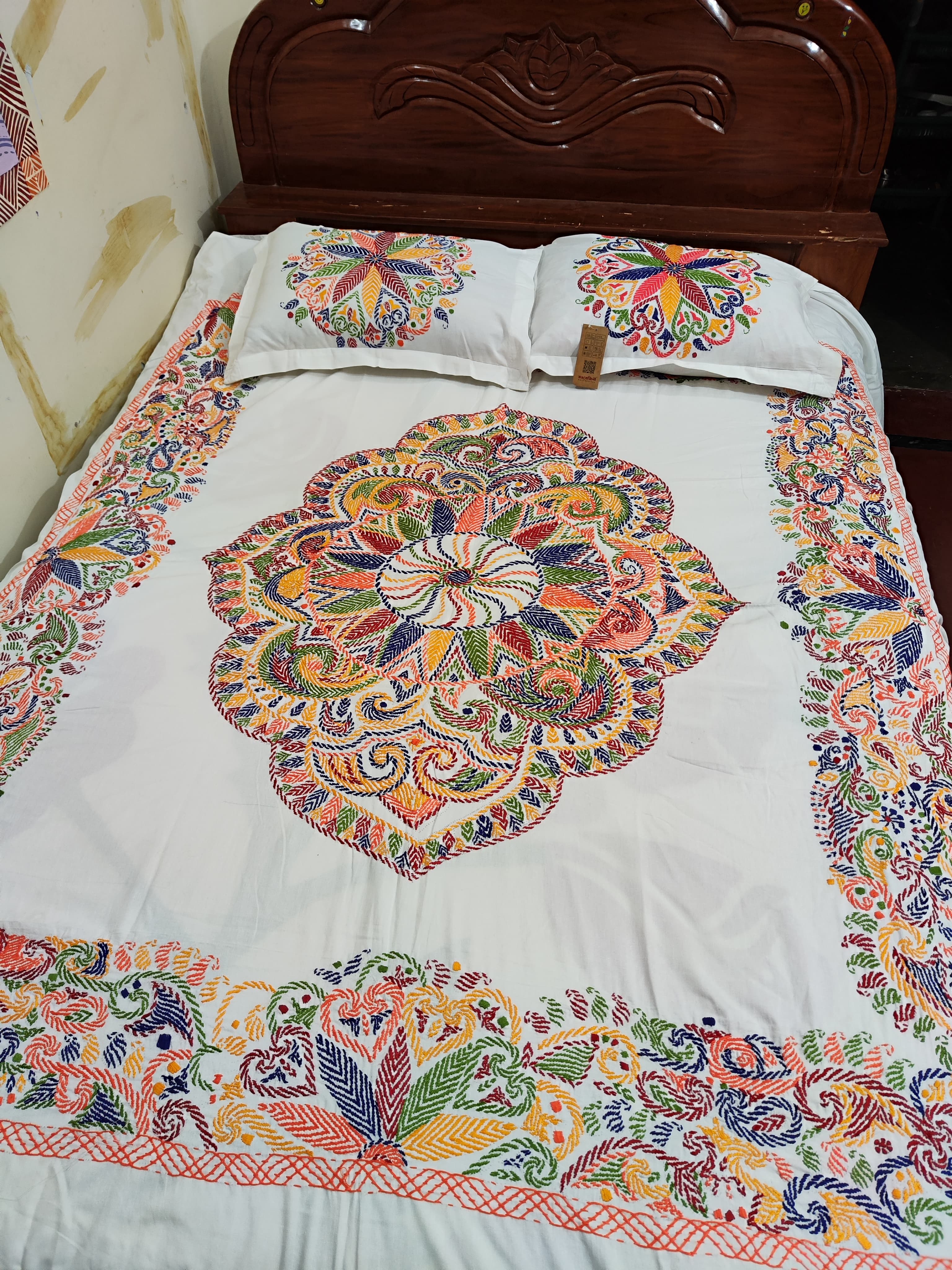 Handcrafted Cotton Bed Cover Set With Colorfull Embroodery(Includes pillow Covers)