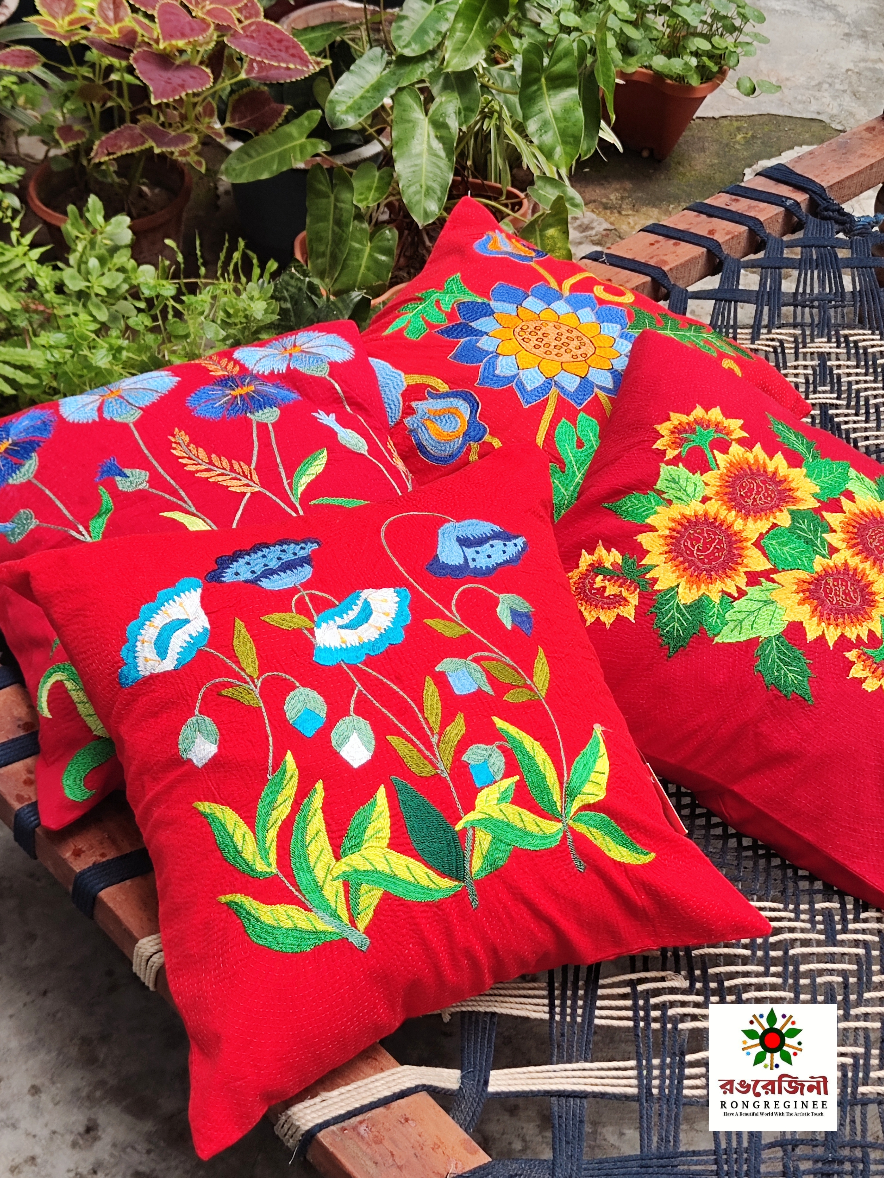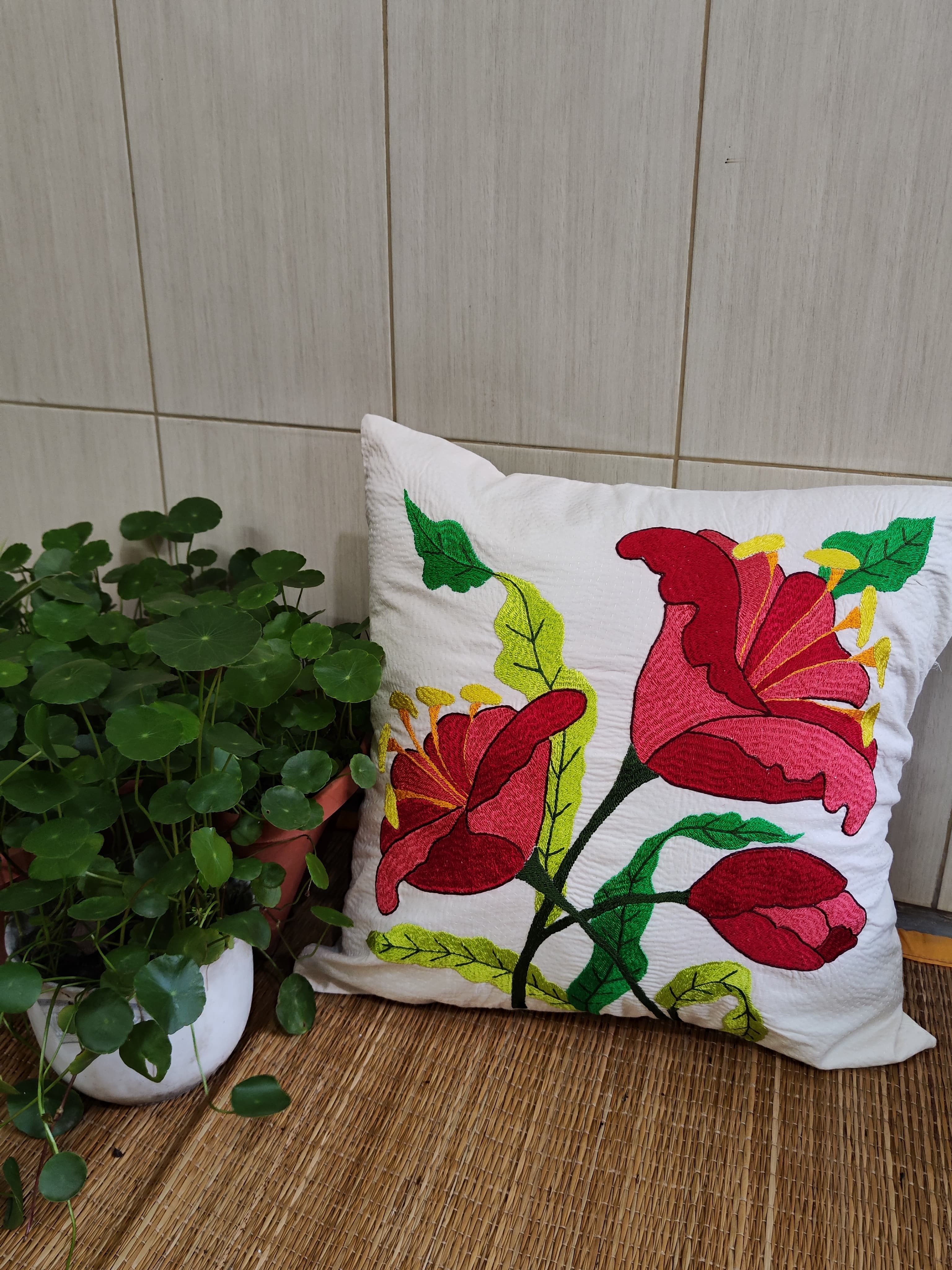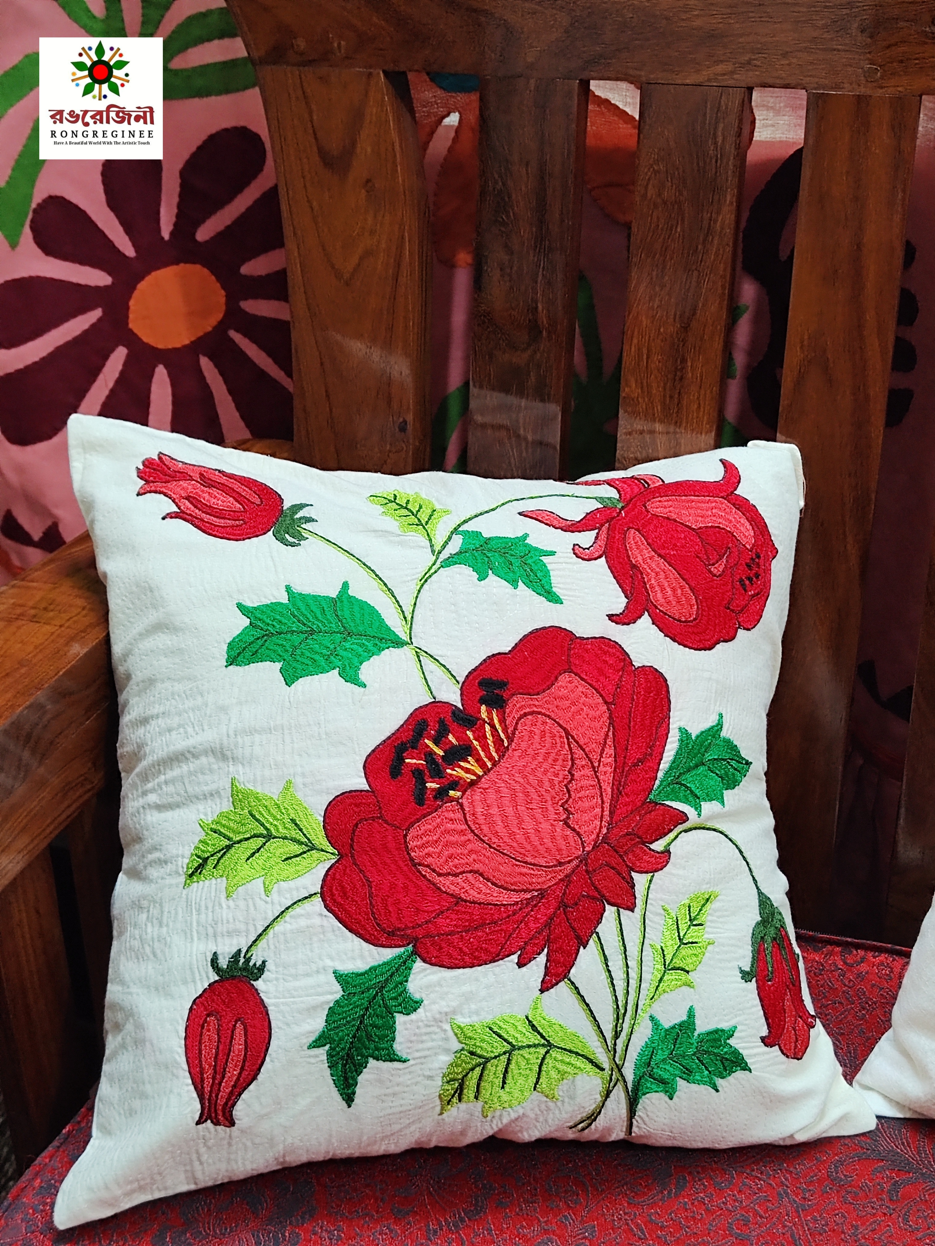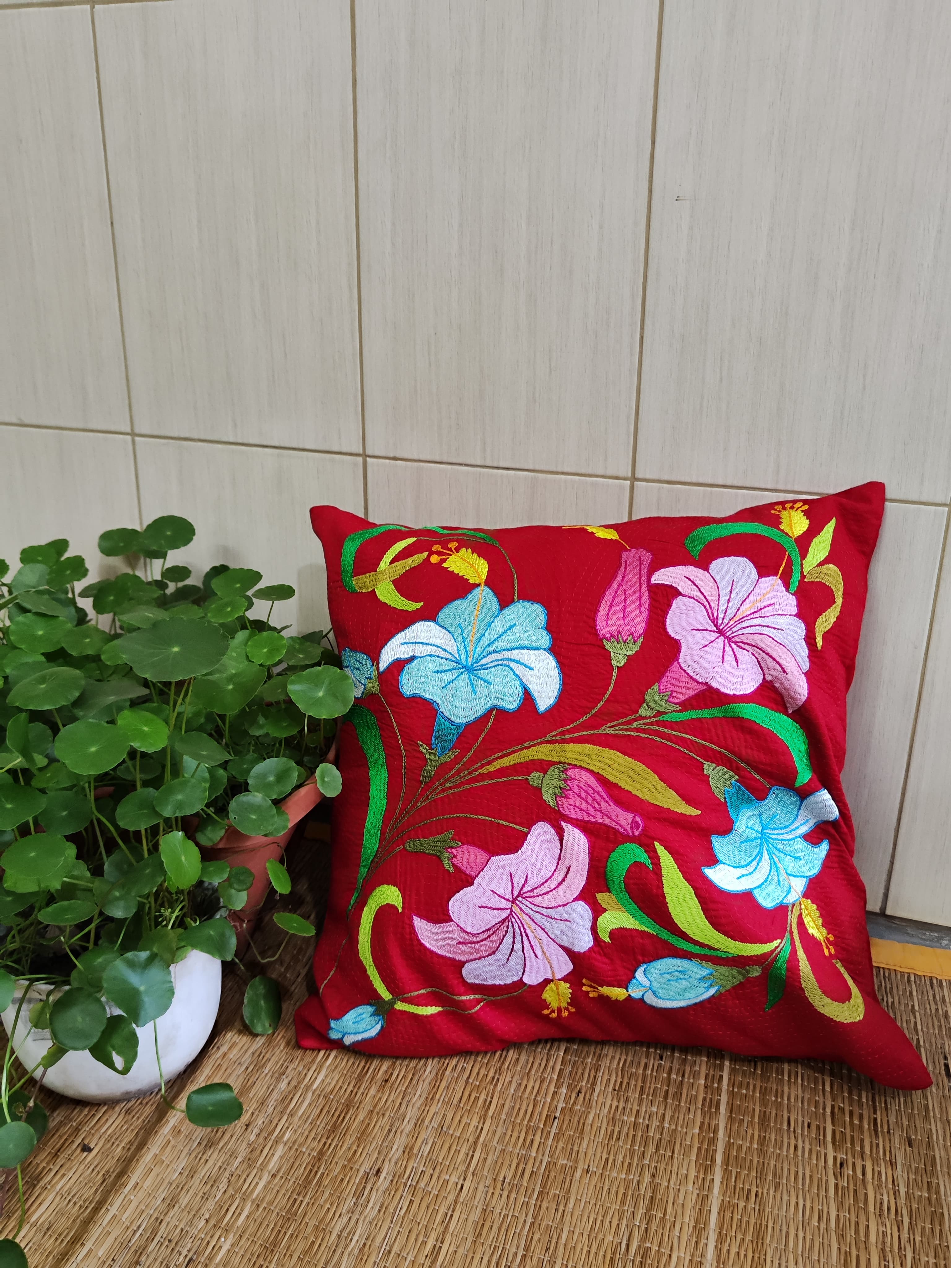 Hand Embroidered Floral Cushion Cover-Red Flower Design
