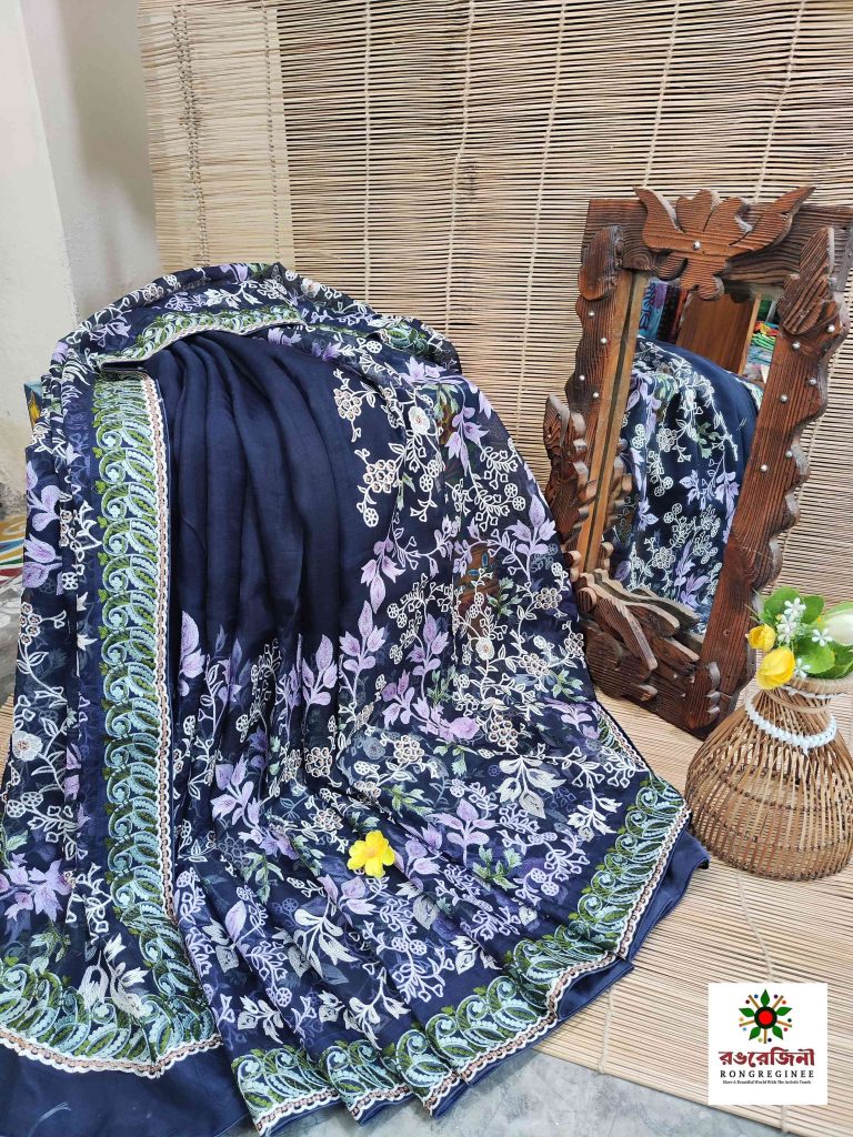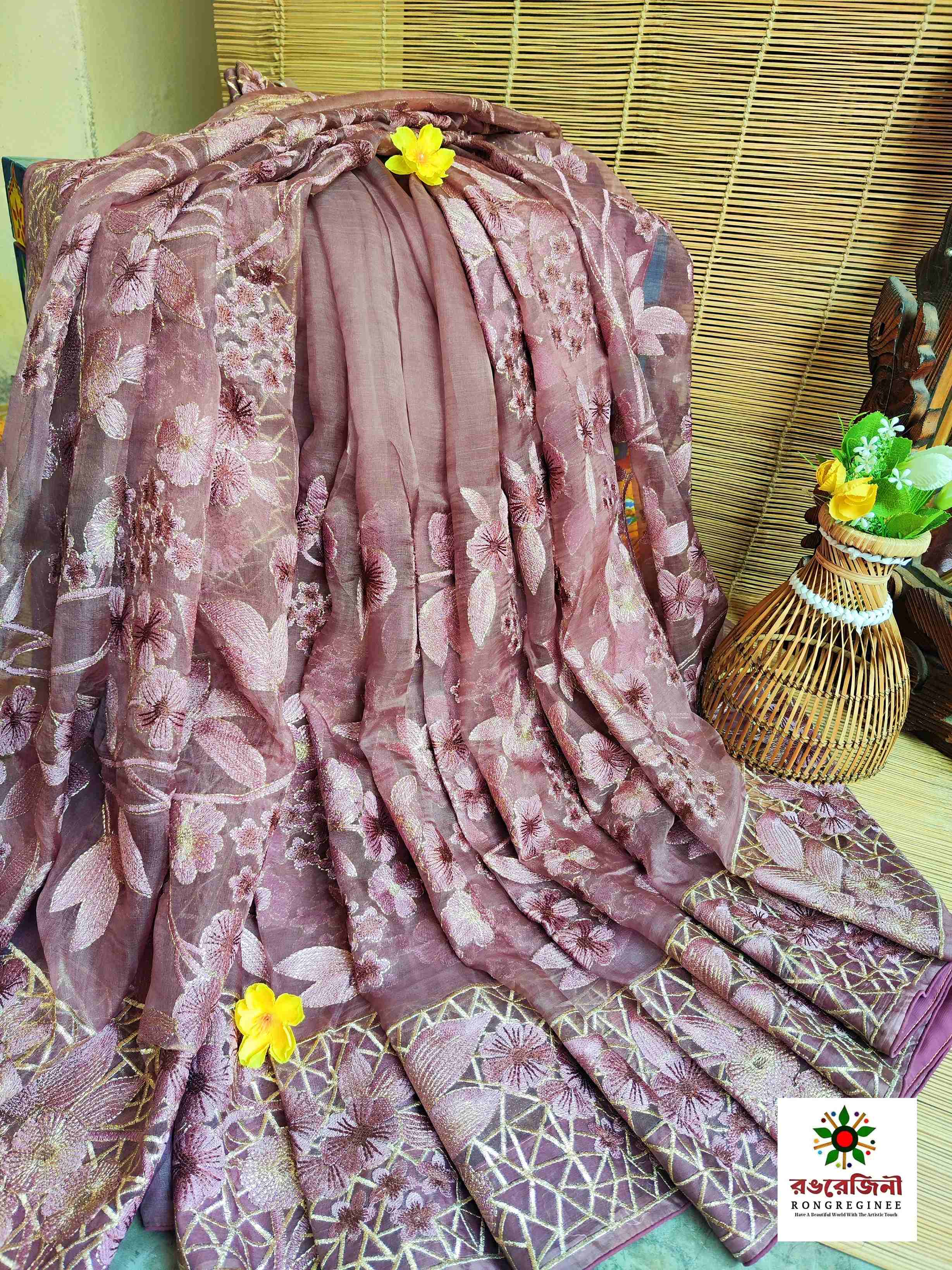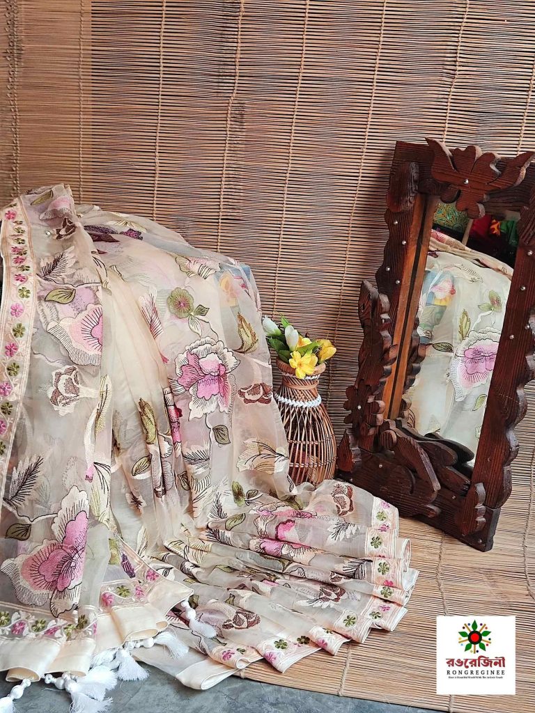 Hand Embroidered Soft Silk Saree-pastel Golden Floral Elegance