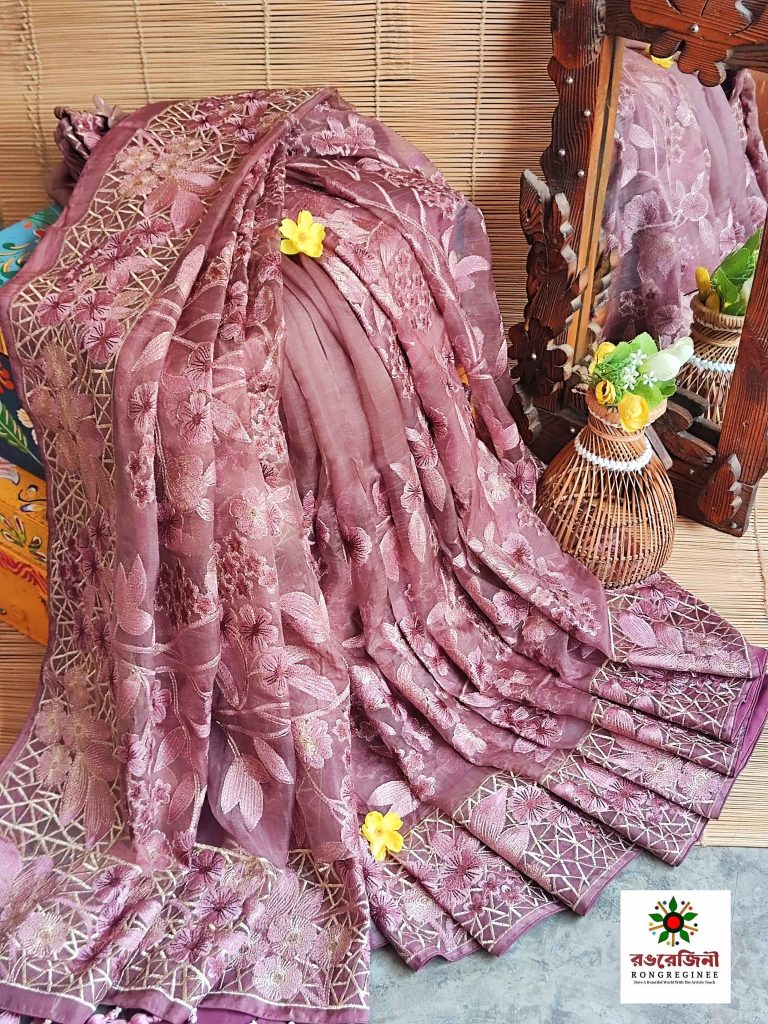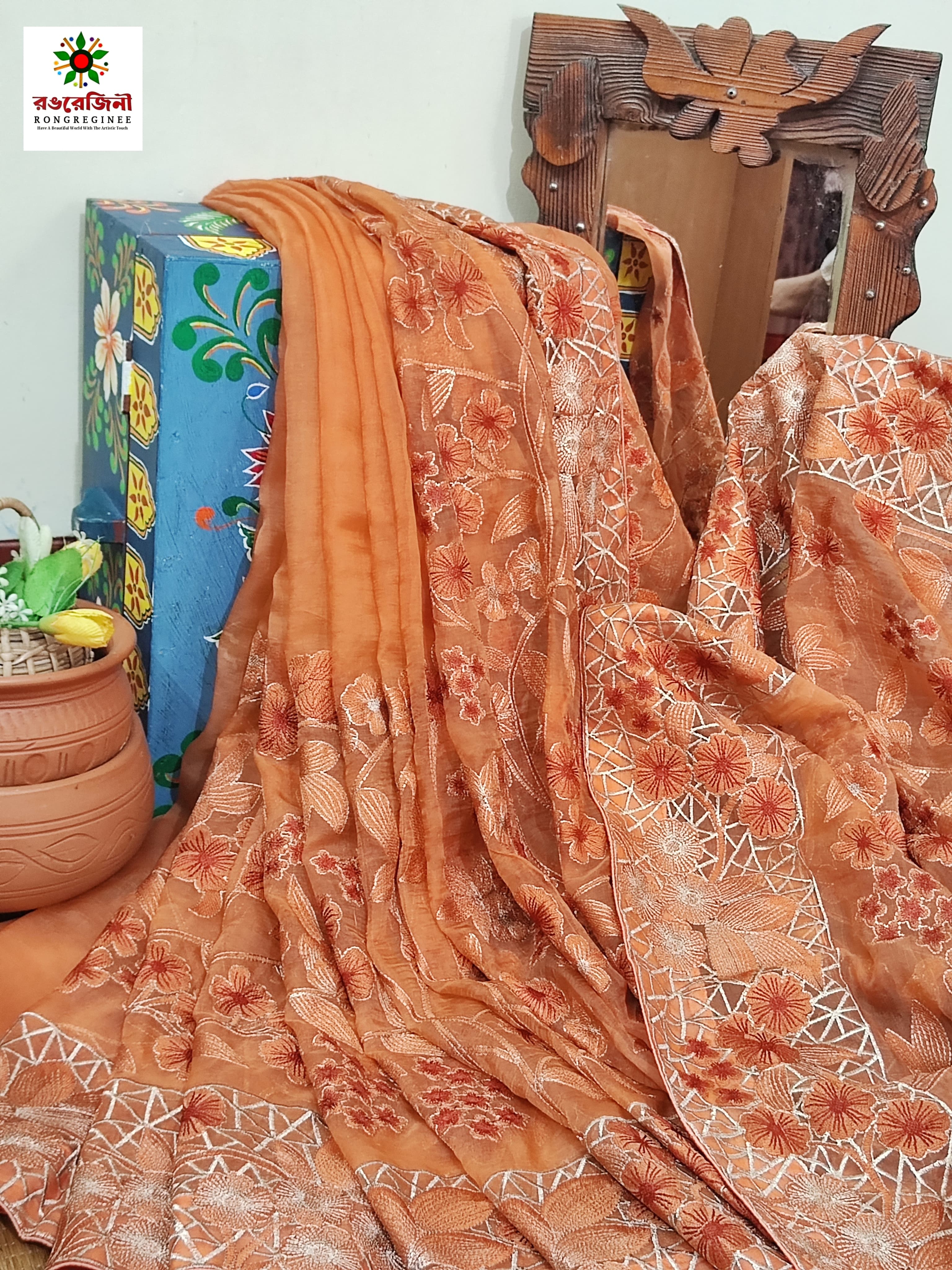 Handcrafted Orange-Gold Silk Saree With Delicate Floral Embroidery