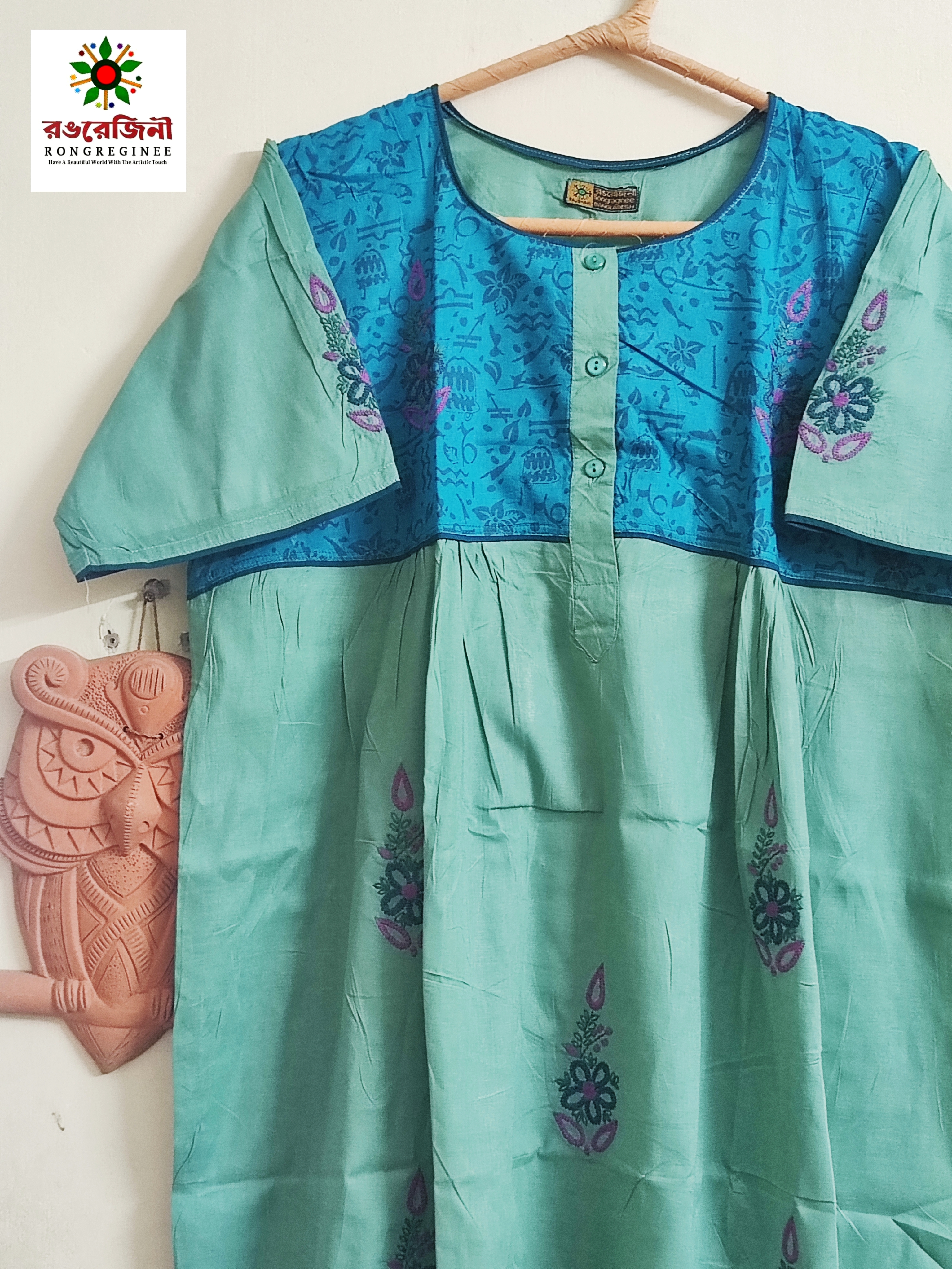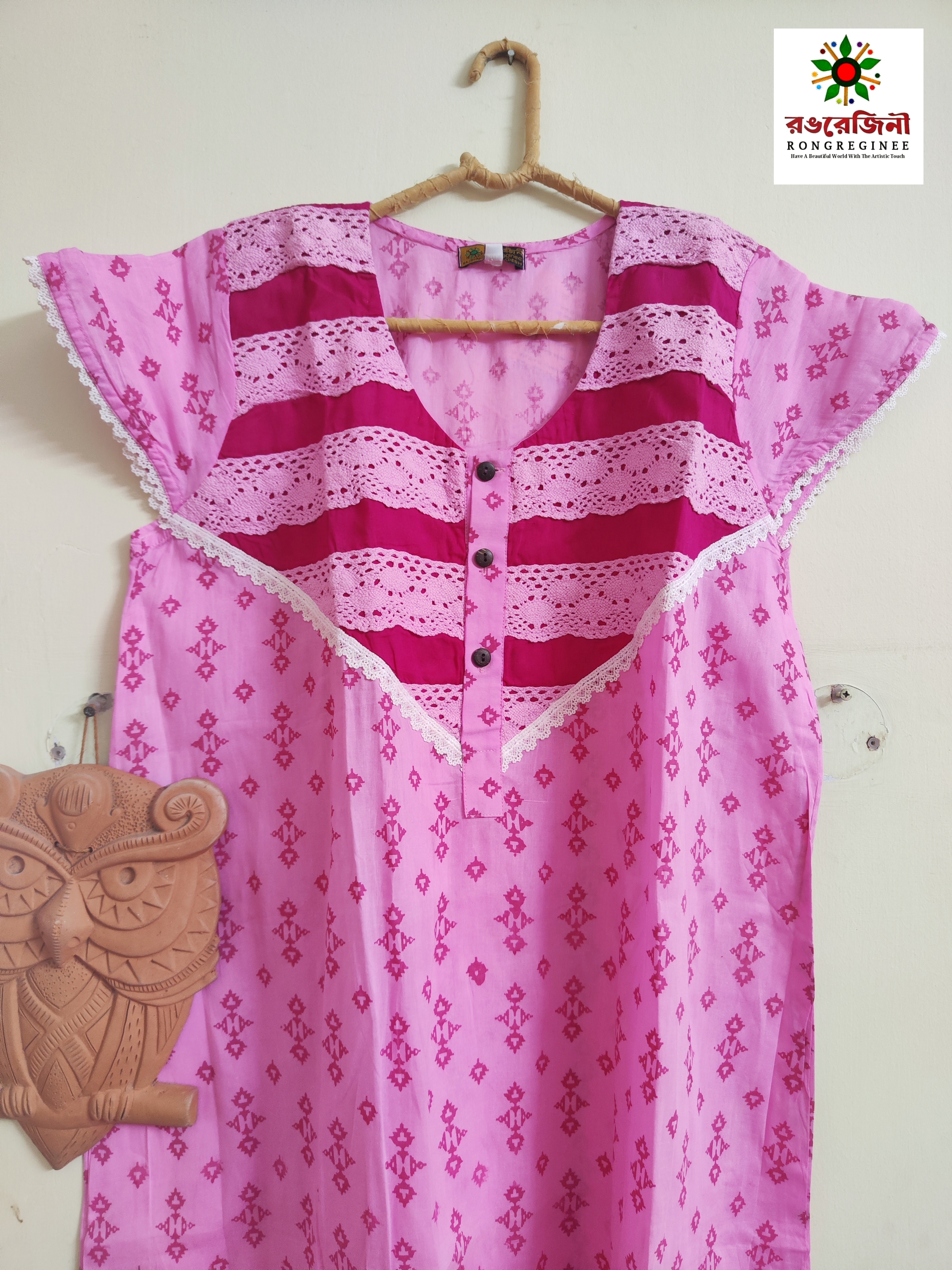 Soft Pink Pure Cotton Nightgown with Traditional Lace & print