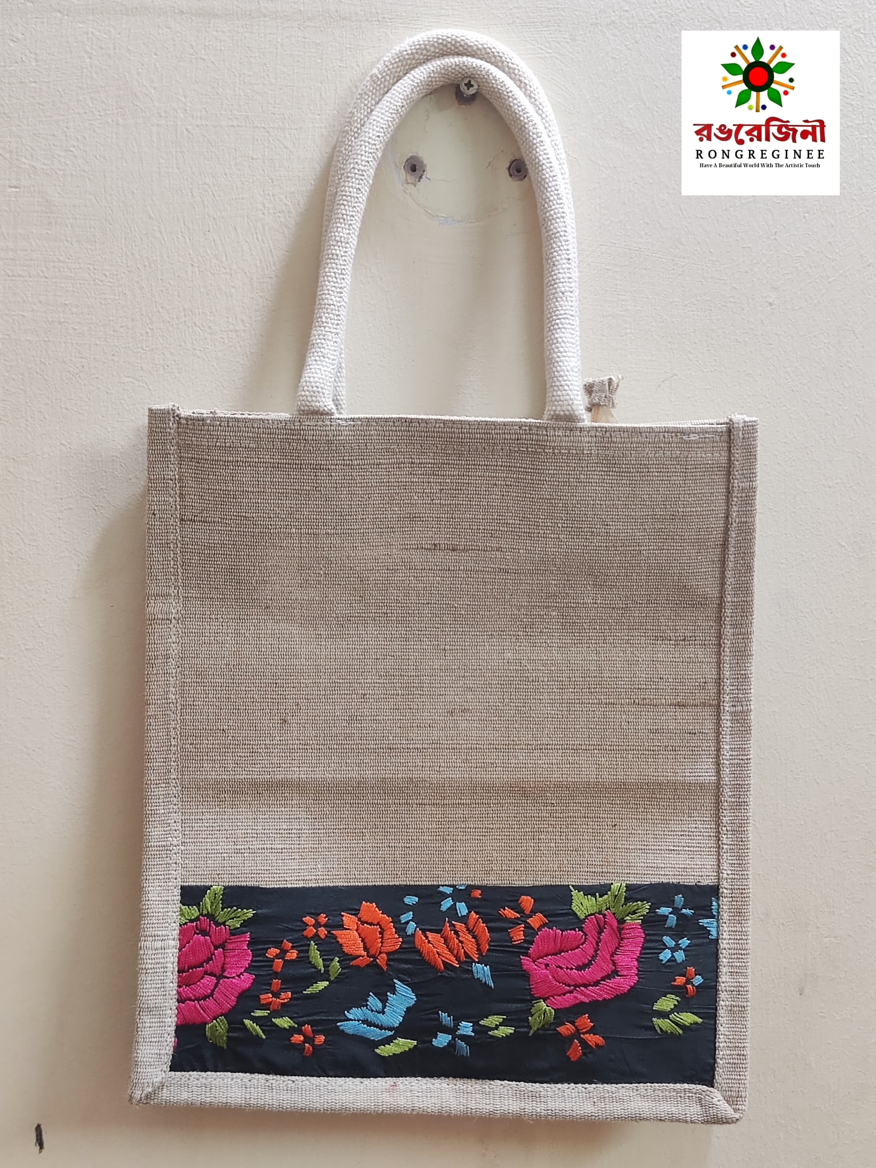 Handcrafted Red Jute Bag With Floral Embroidery And Drawstring Closure