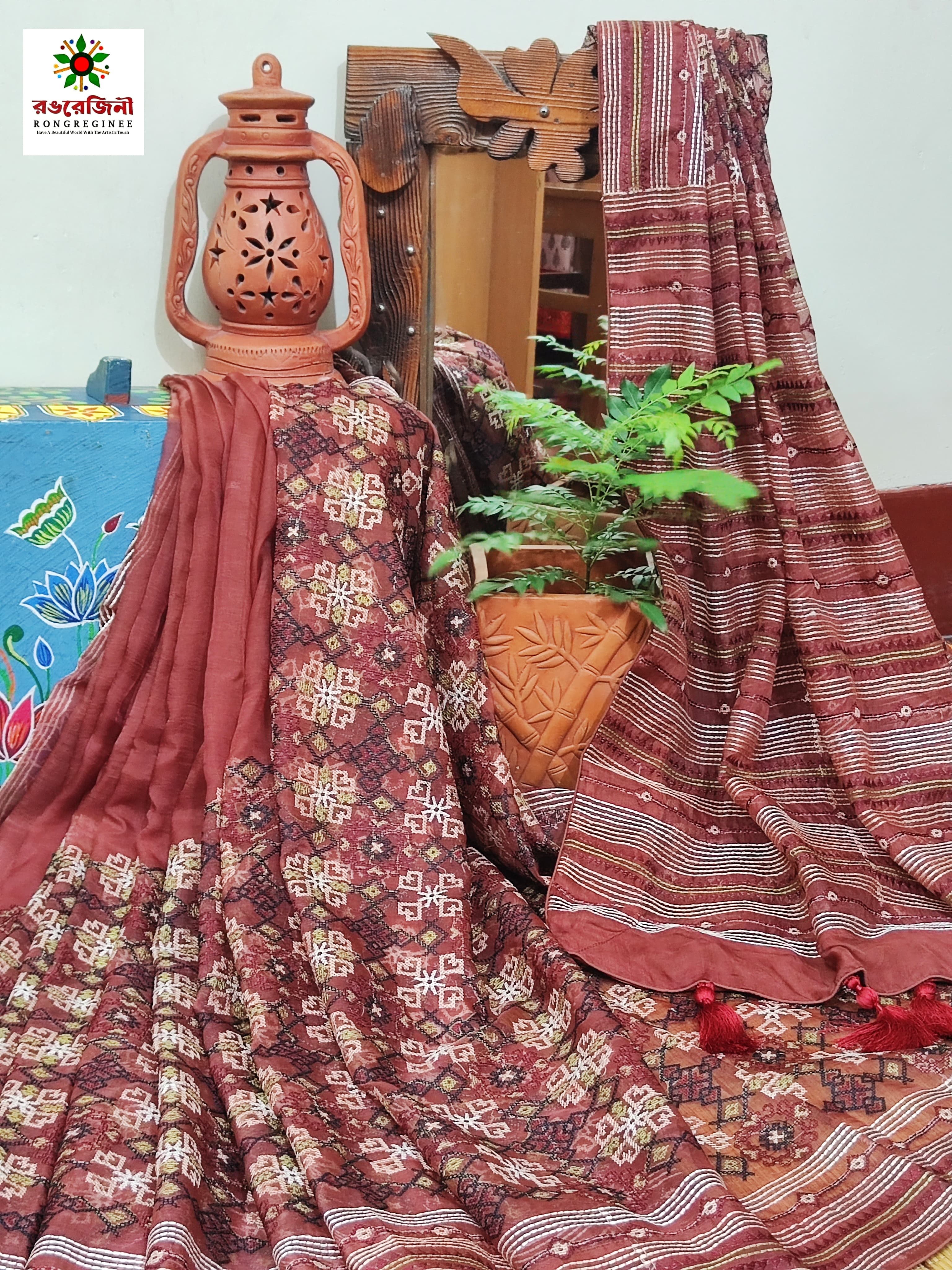Earth- Toned Printed Handloom Saree_ Floral Motifs & Striped Pallu