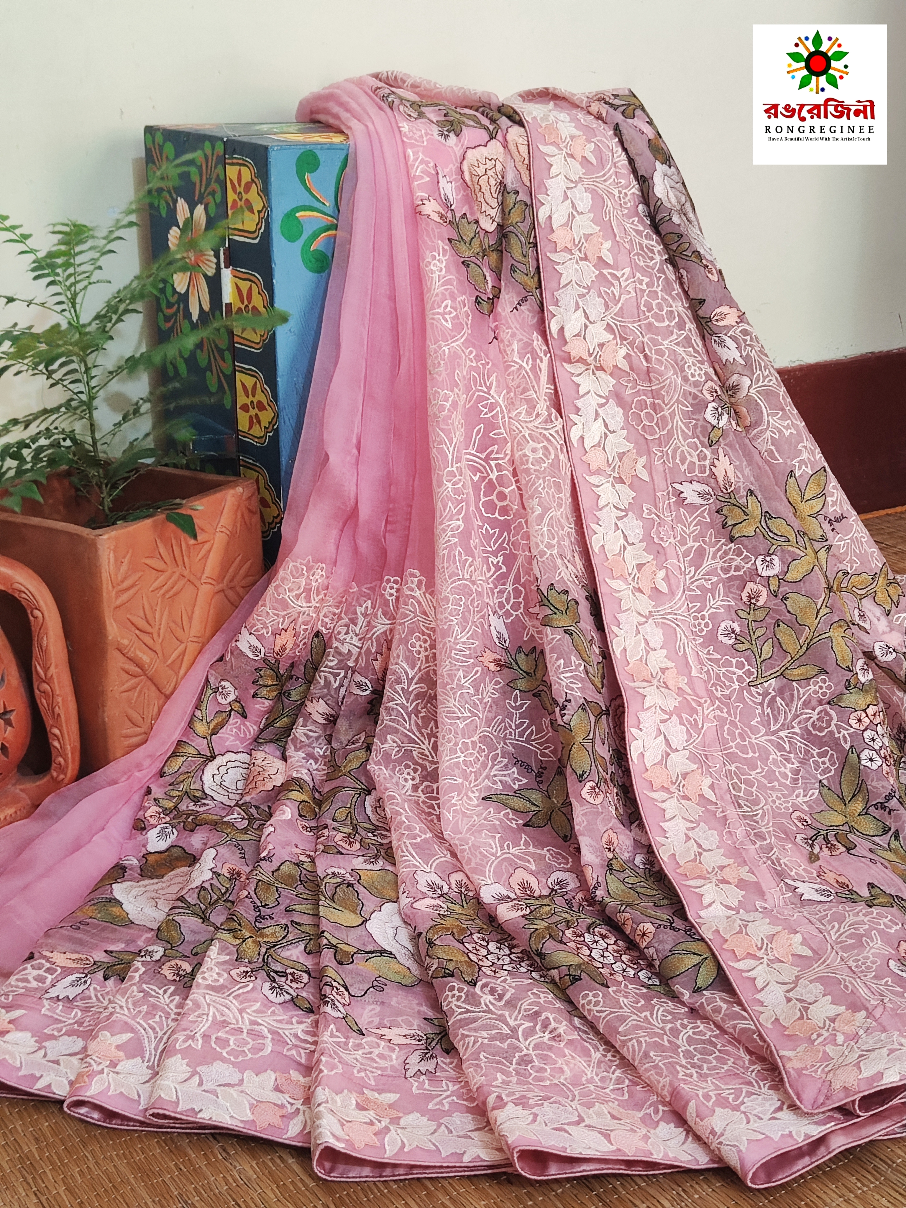 Blush Pink Floral Embroidered Saree-Delicate white Threadwork