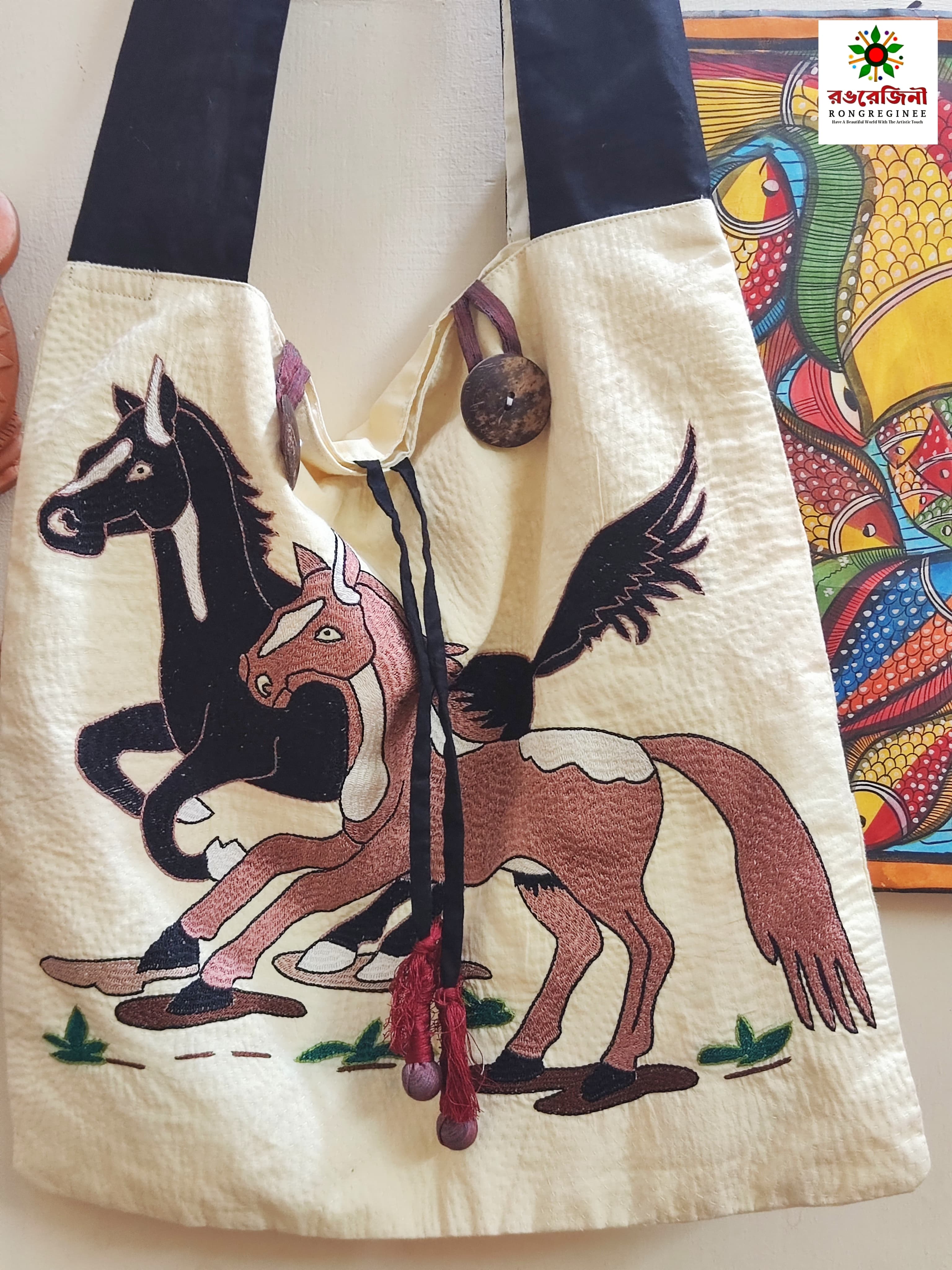 Bring home the soul of rural Bengal through this stunning handmade folk art tote bag. Crafted from high-quality cotton fabric, this bag features a hand-painted traditional horse motif, symbolizing strength, freedom and heritage. Each bag is carefully created by talented women artisans from village communities, making every piece truly unique.