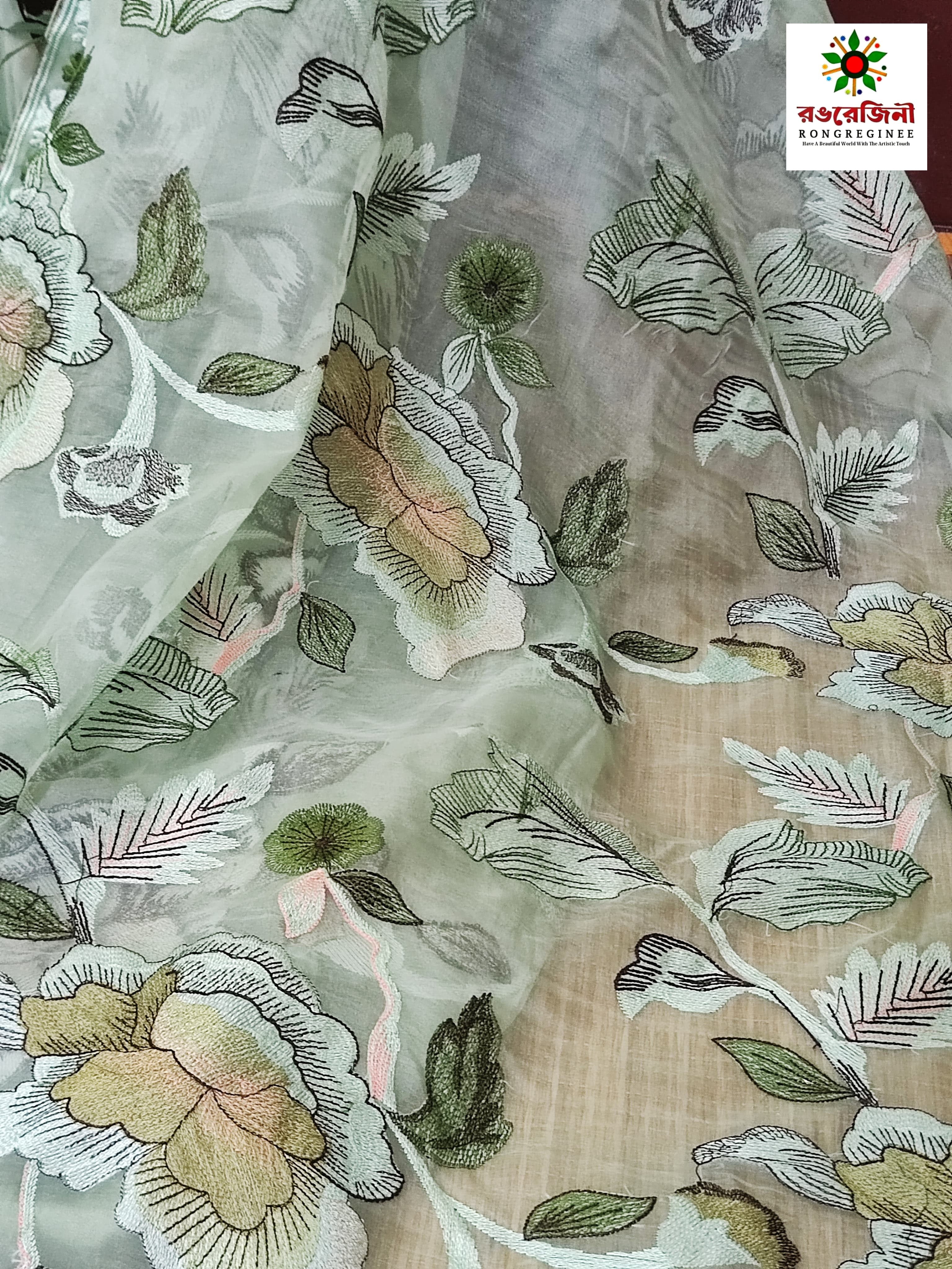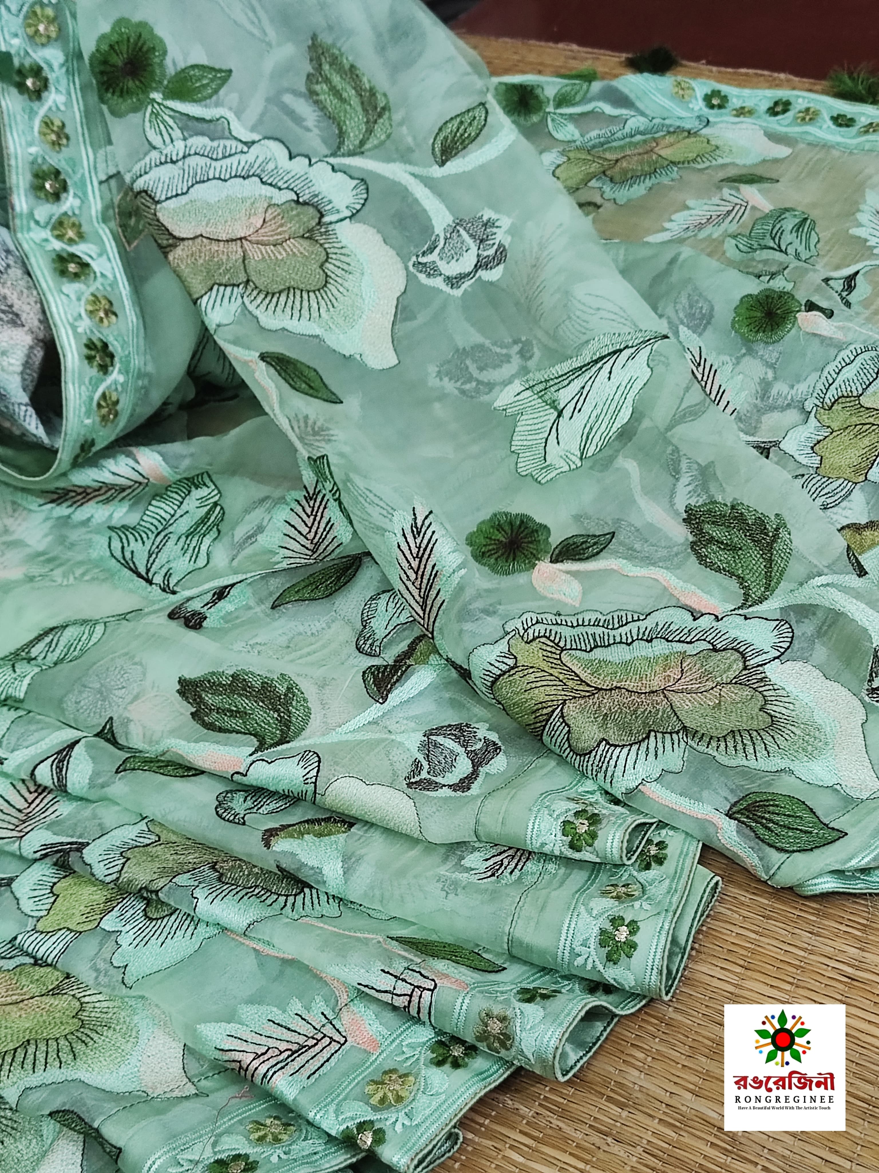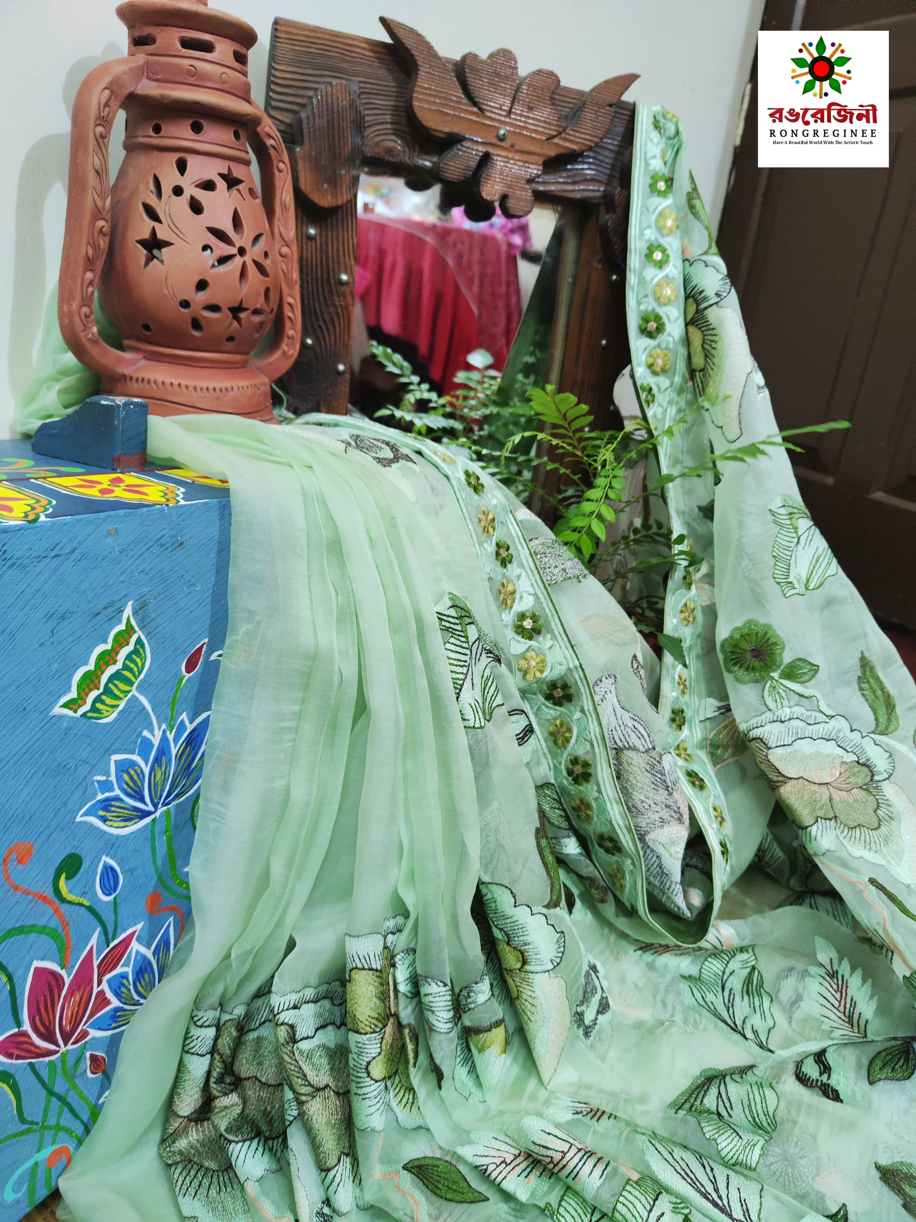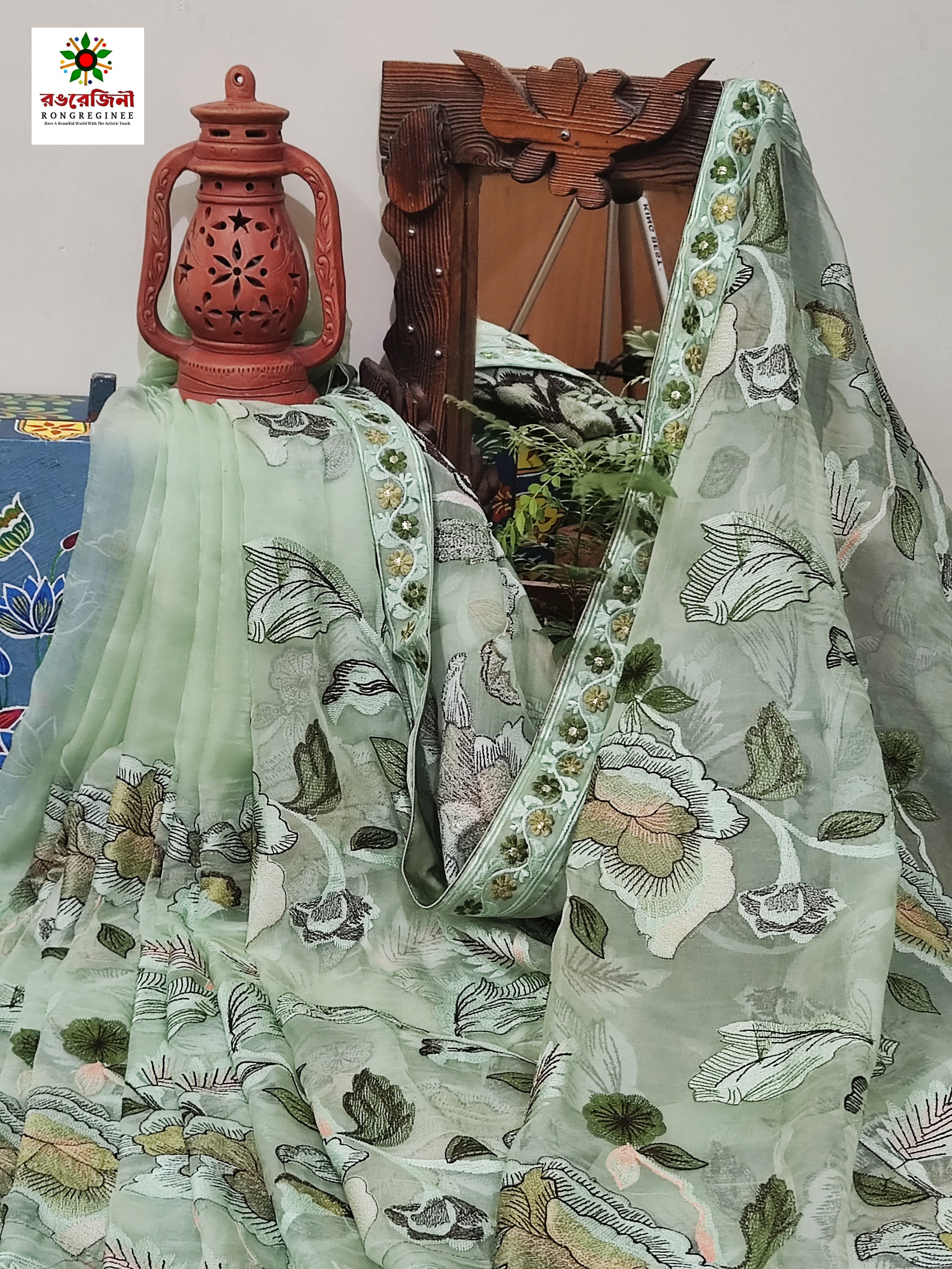 this design is a celebration of subtle elegance, featuring a detailed flowers in soft shades of cream, muted yellow and deeper greens. The soothing Pastel green base makes it an ideal choice for daytime events, casual gatherings, or office wear.