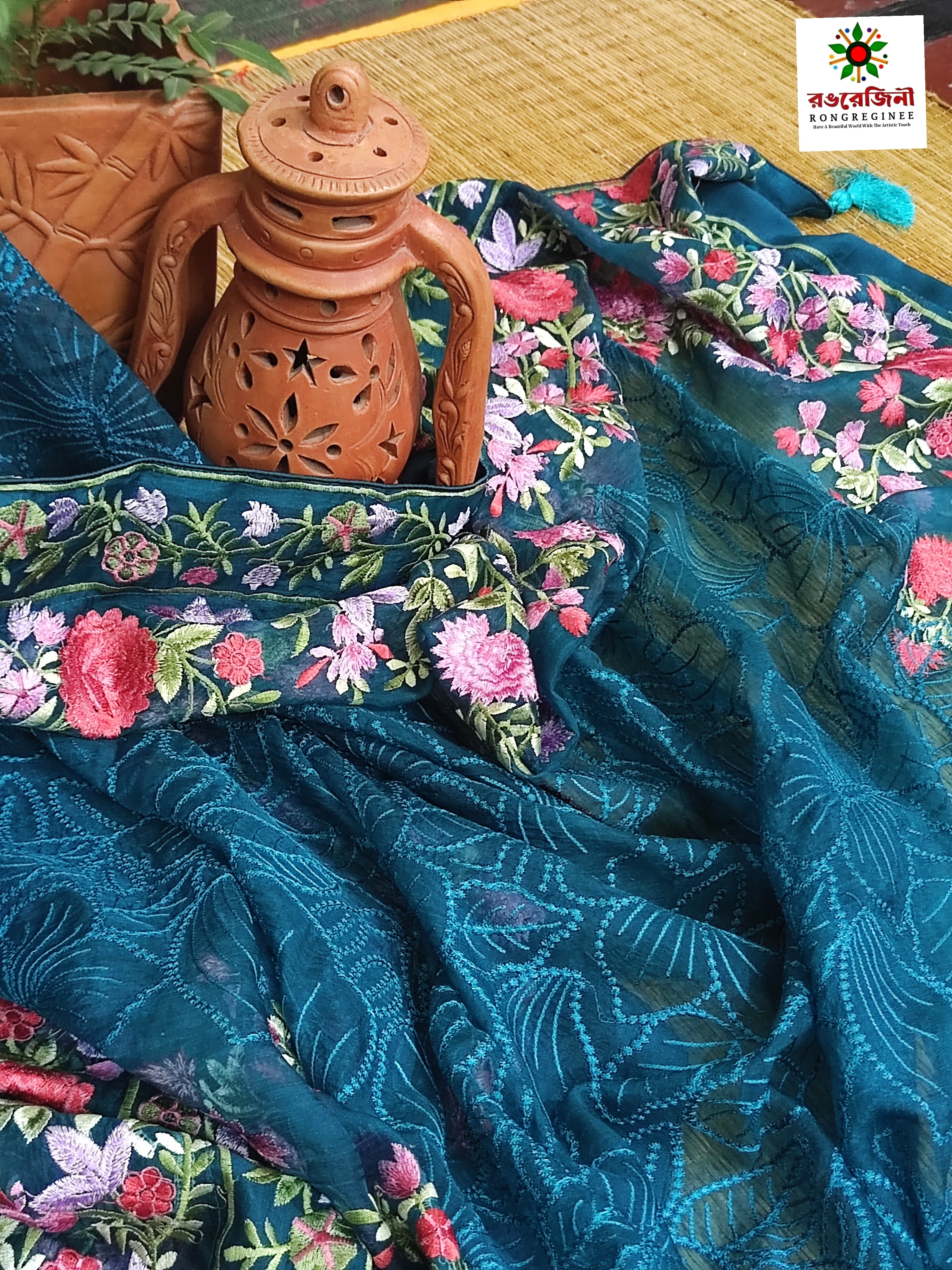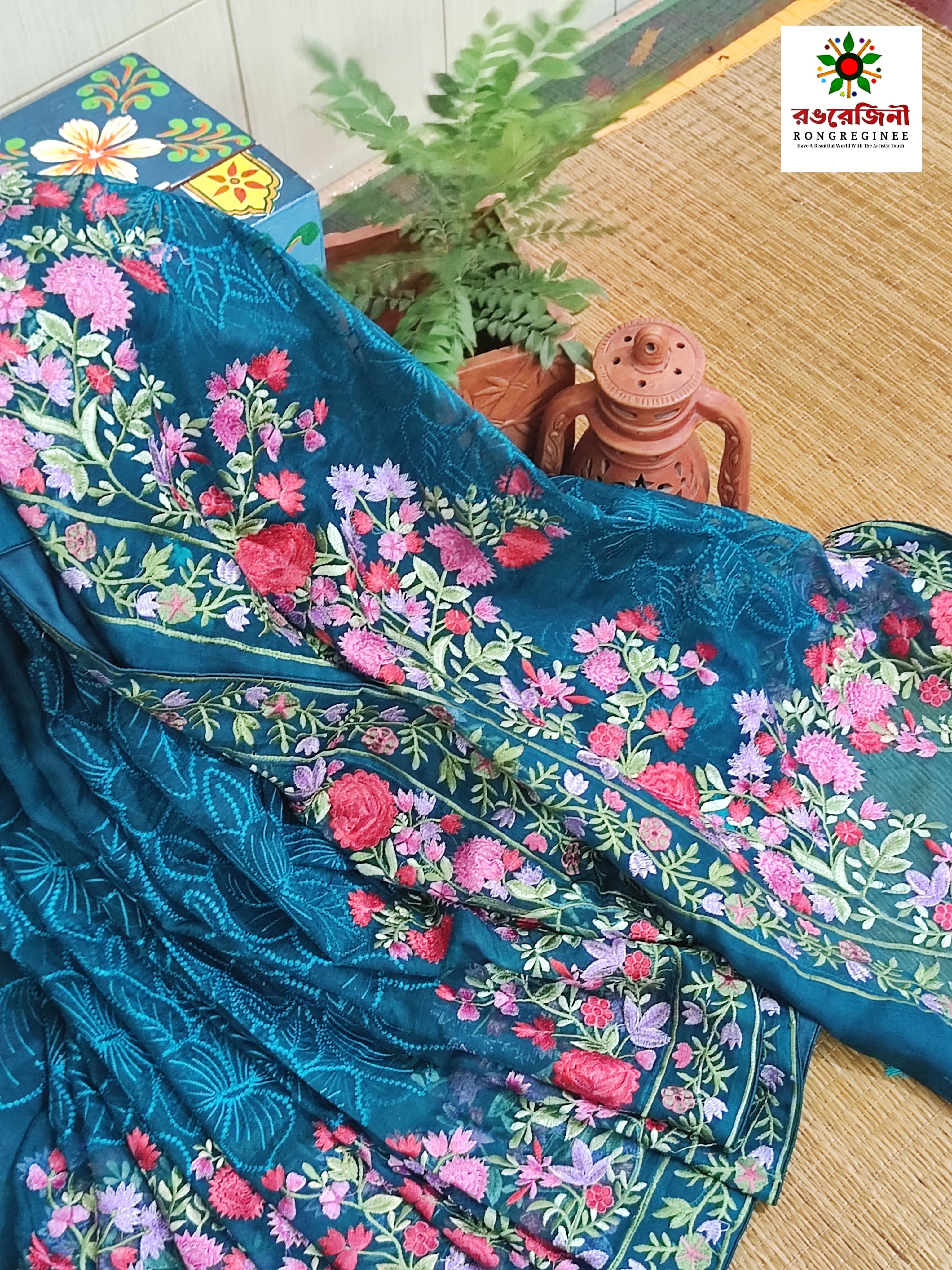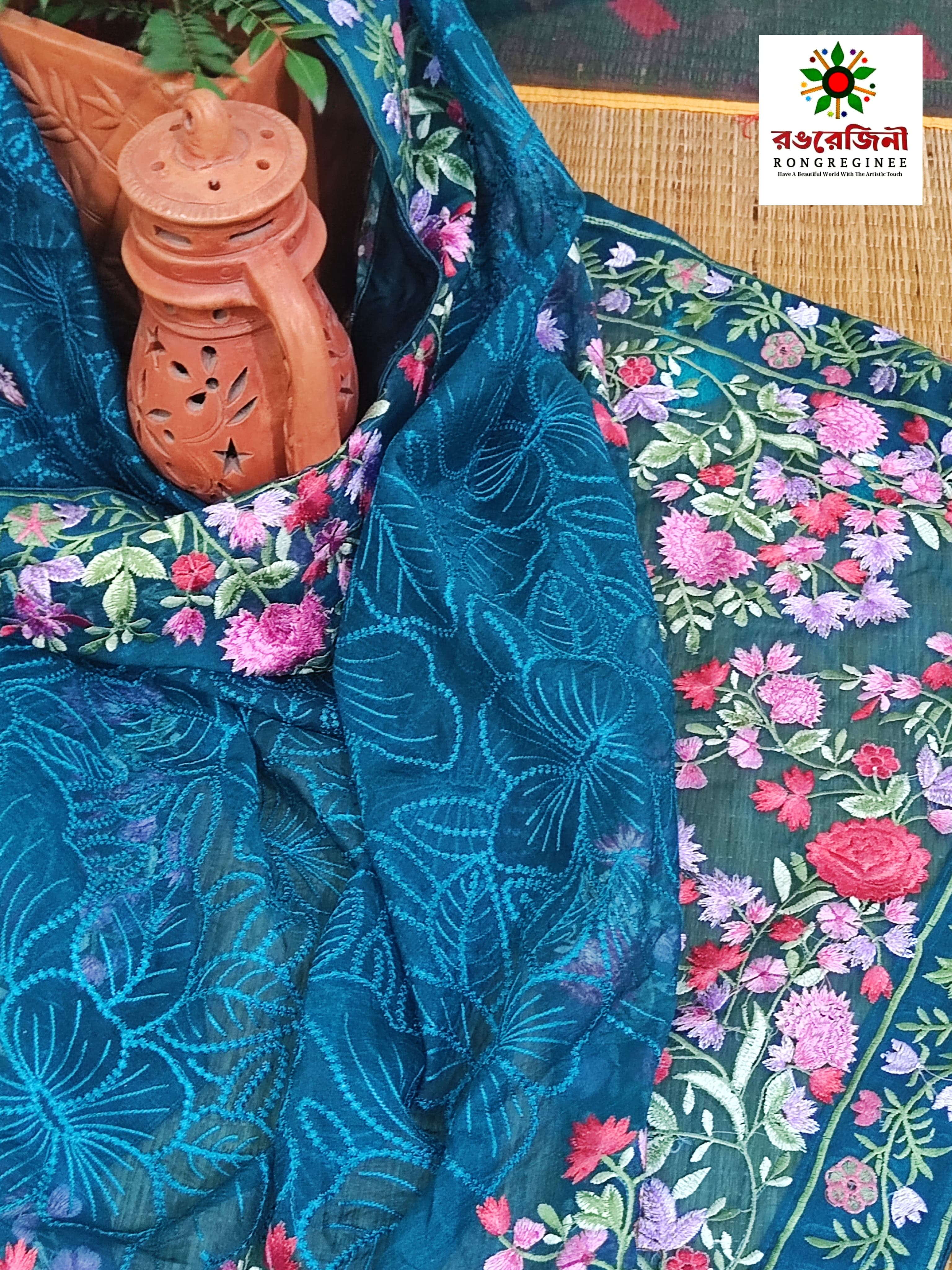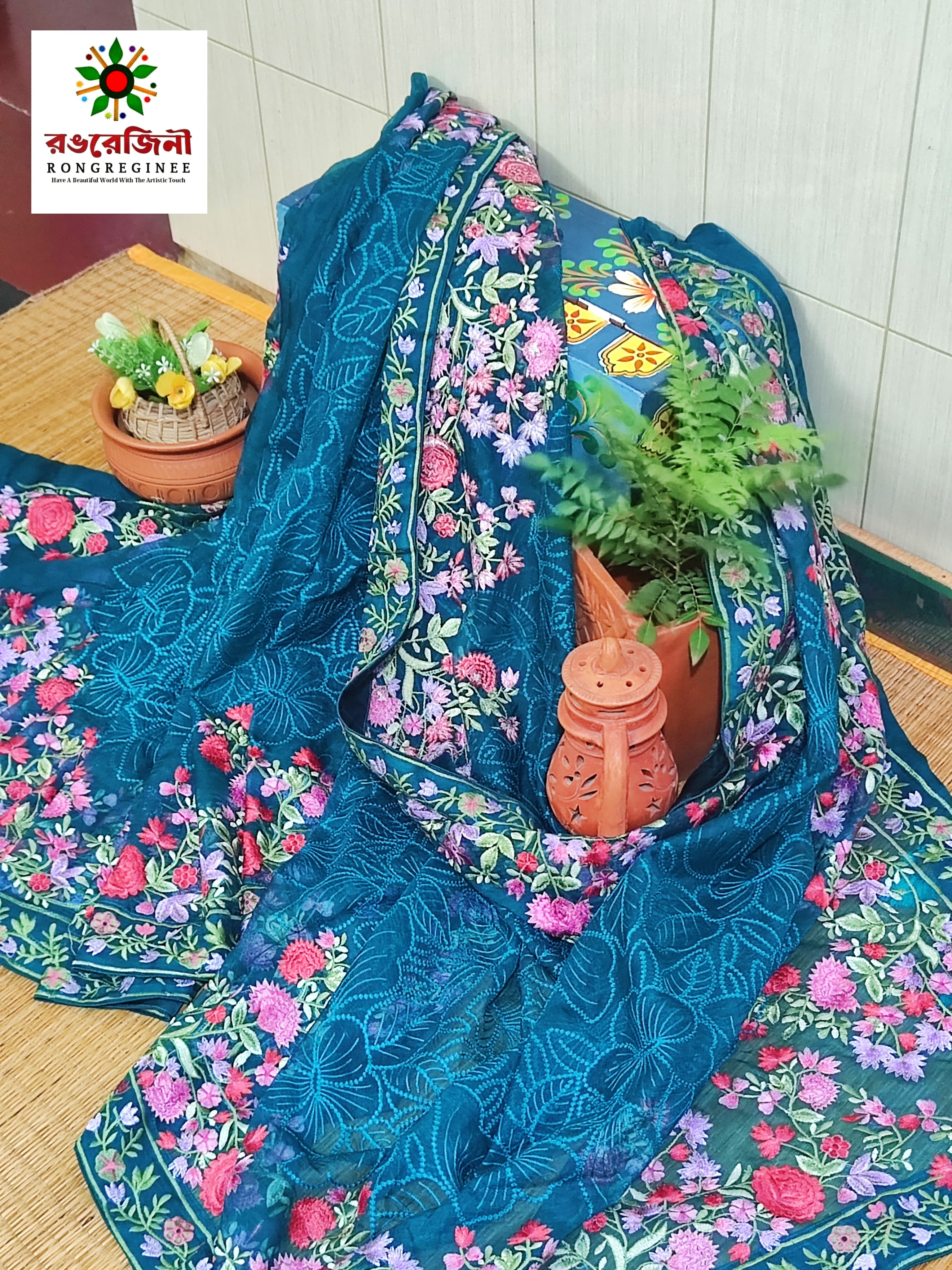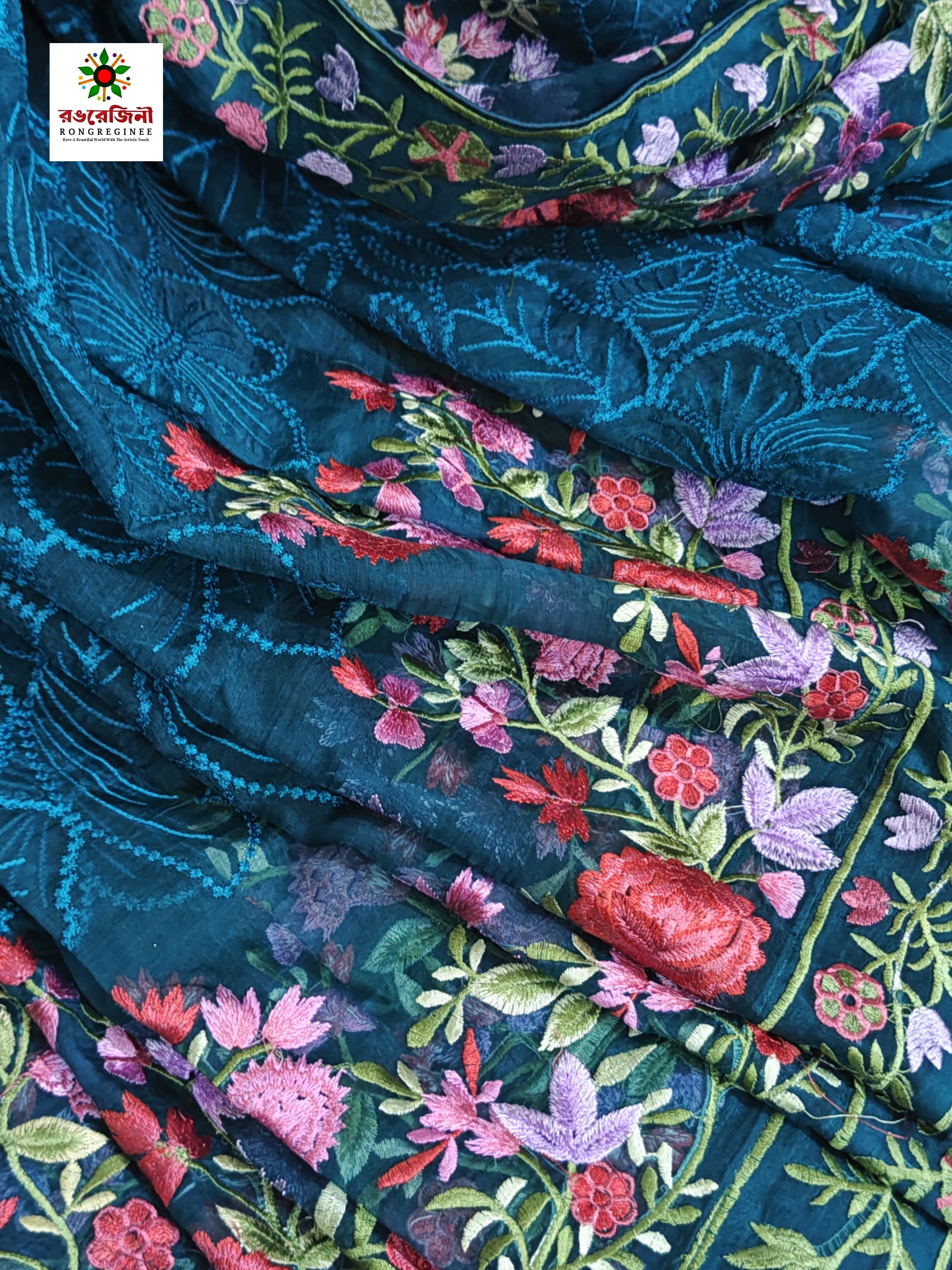 The foundation of this piece is a mesmerizing, deep Regal Blue- a shade universally associated with sophistication and poise_ that immediately captures attention. Adorning this luxurious base is a dense, all-over floral pattern featuring beautiful blooms and delicate vines rendered in vibrant hues of pink, rose and sage green. The artistic detailing of the print is meticulously executed, giving the stunning illusion of delicate, hand-painted artwork. This craftmanship adds a bespoke and premium feel that ensures your outfit stands out. The concentrated floral motifs along the borders make it perfect for the elaborate pallu of a saree or the dramatic edges of a saree.
