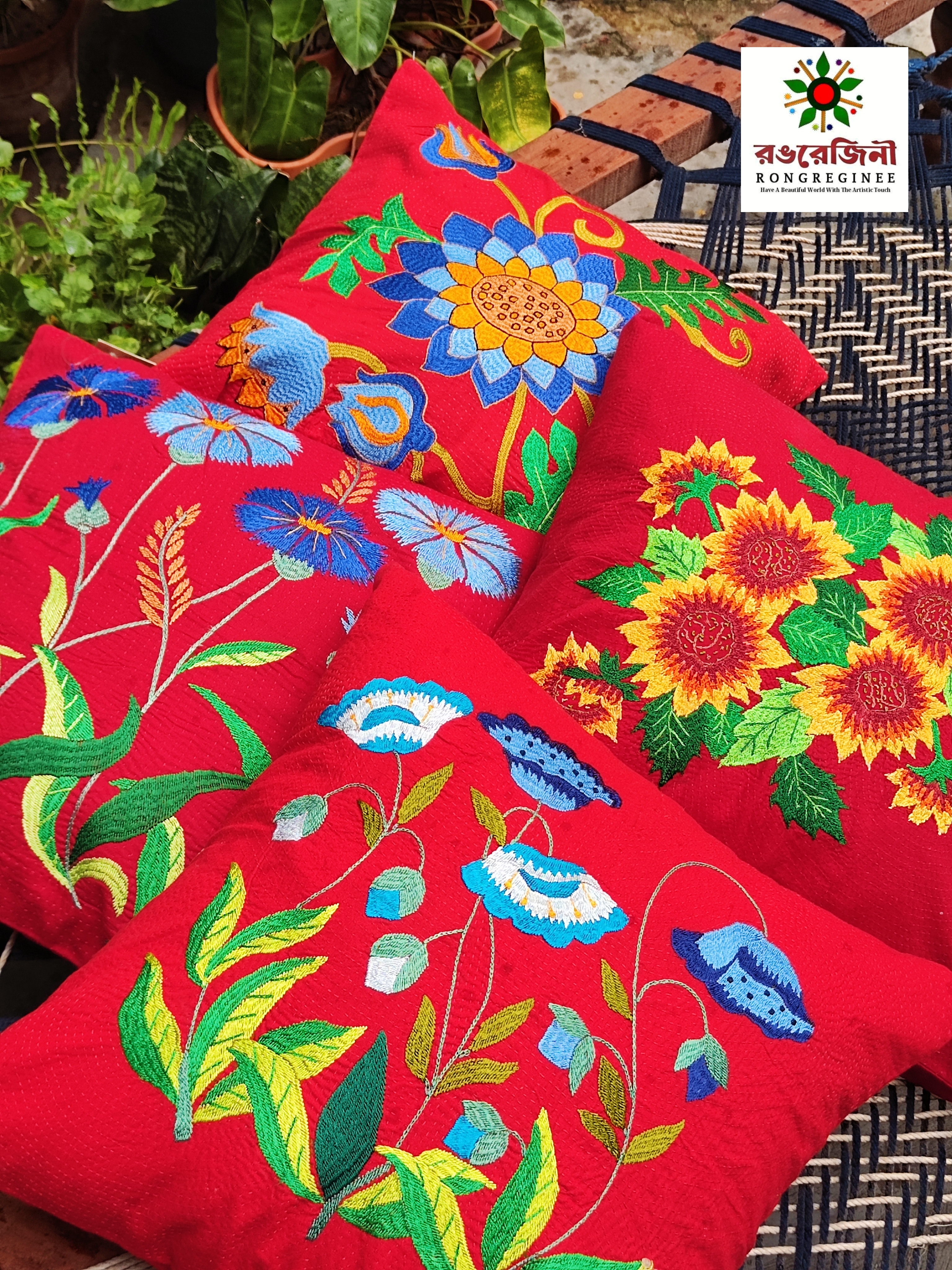 This handcrafted cushion cover celebrates the beauty of Bangladeshi Embroidery. The rich Multi color floral design symbolizes love and vibrancy, beautifully contrasted on pure red base. ideal for those who appreciate artistry and comfort in home décor. each piece is individually stitched by skilled artisans, making every cushion cover slightly unique _a true piece of handmade charm for your home.