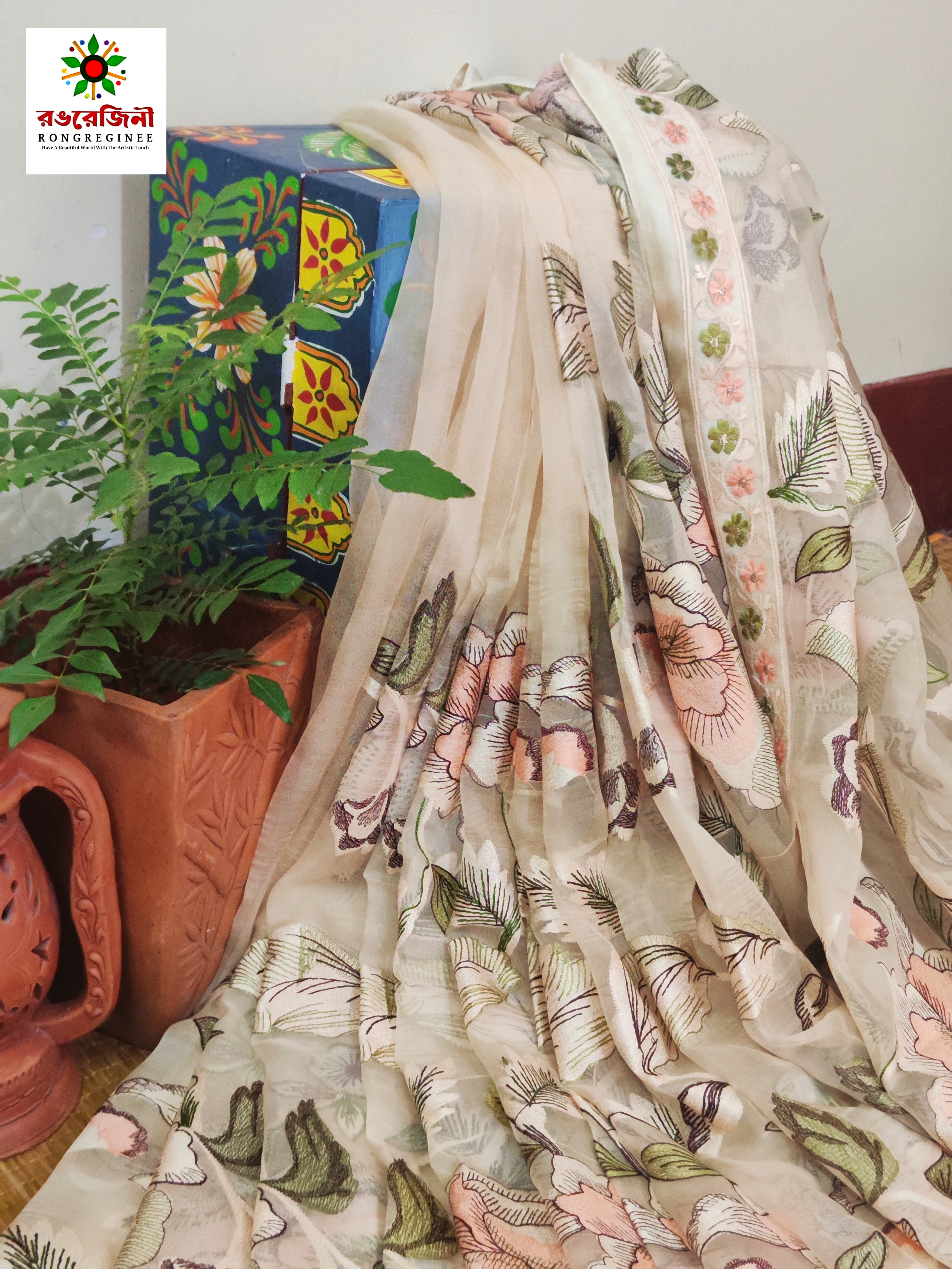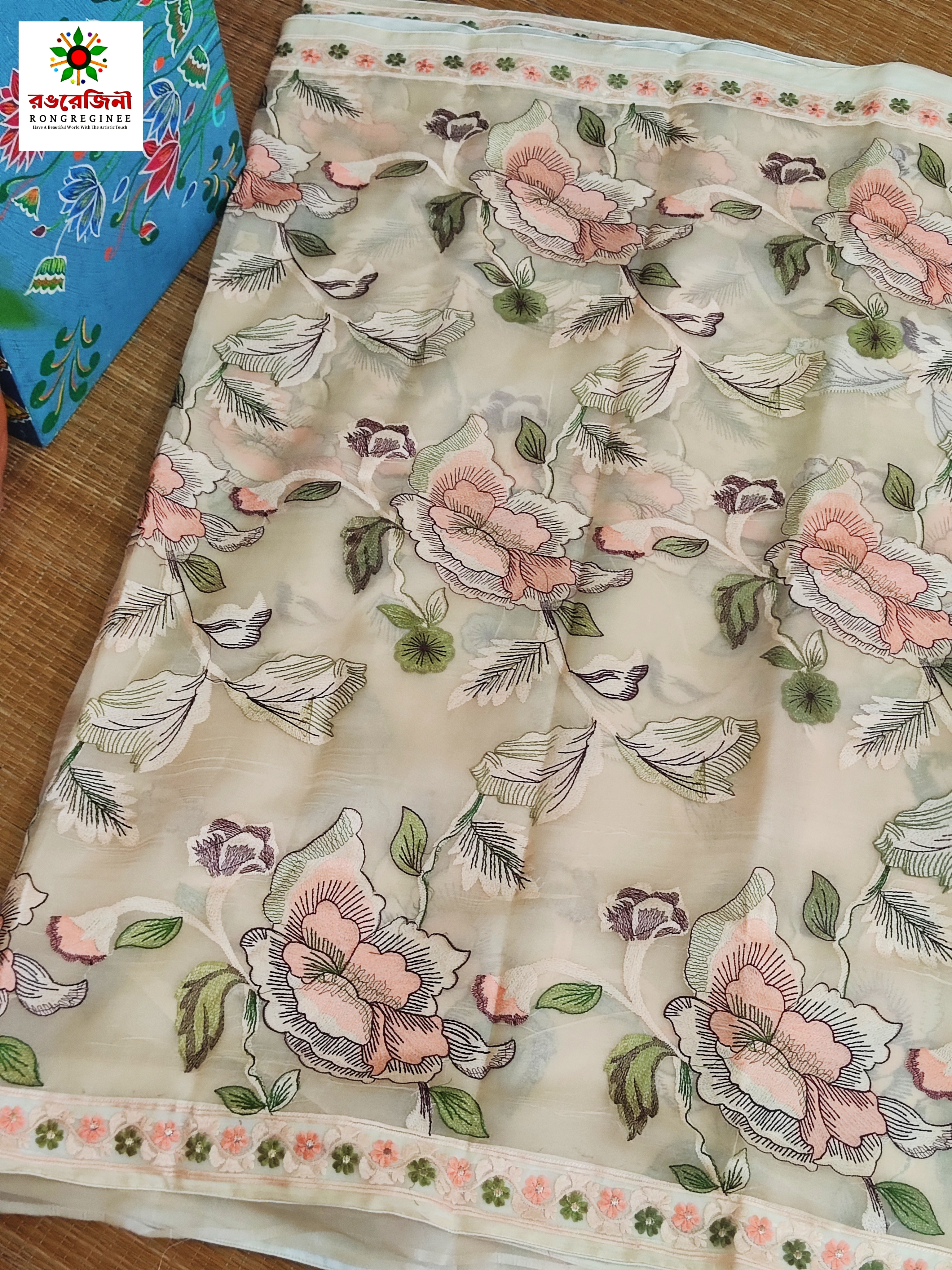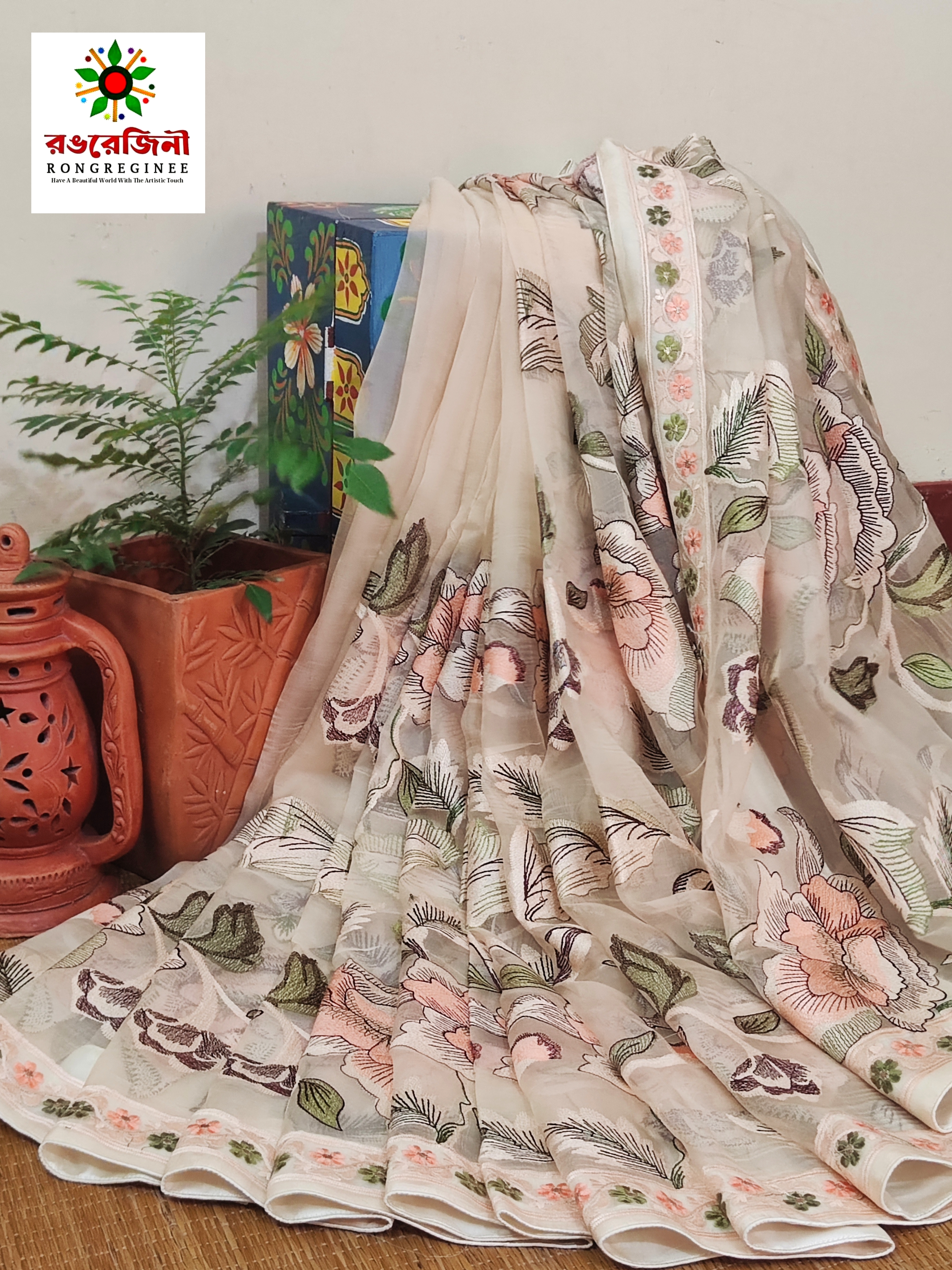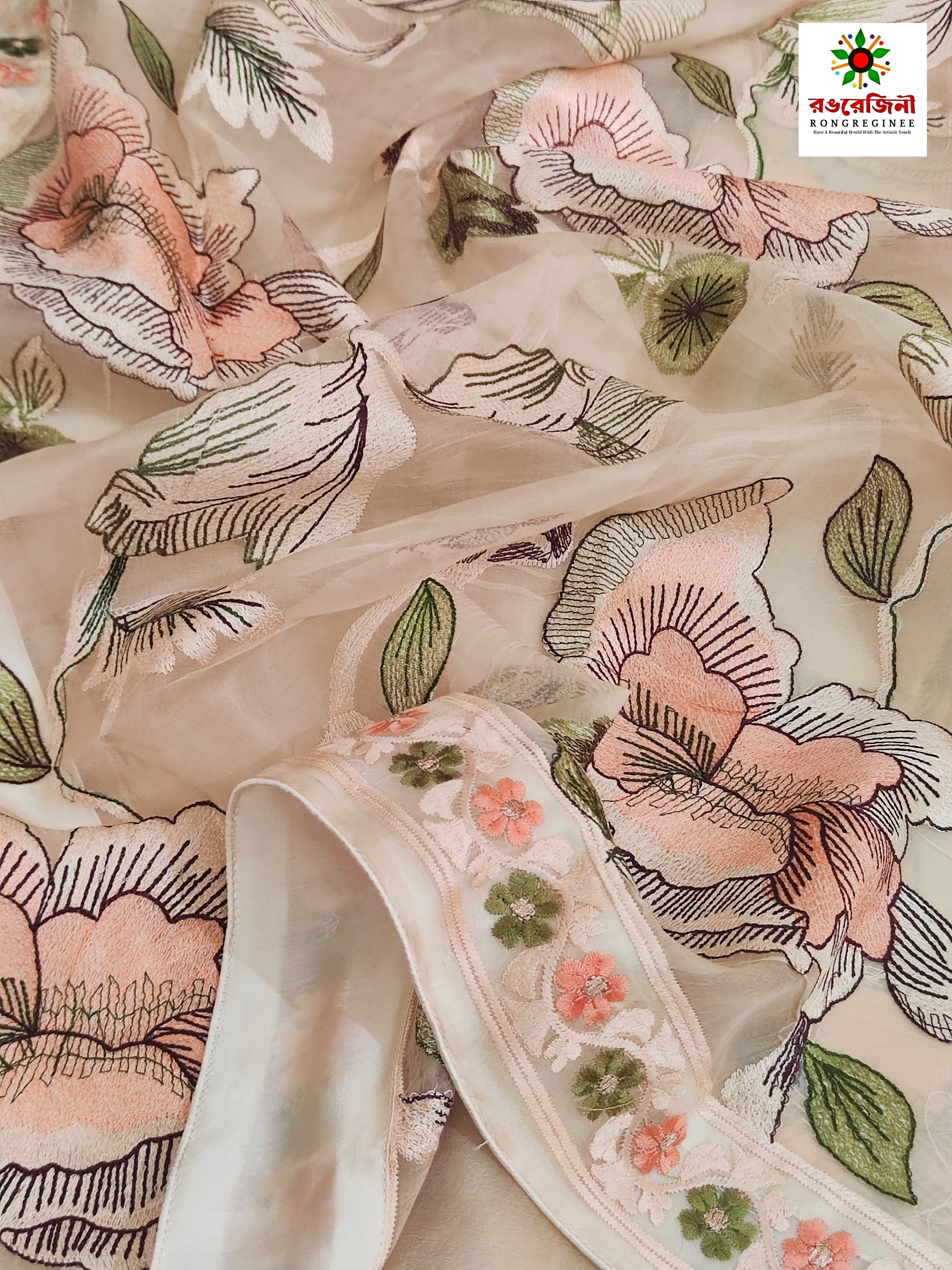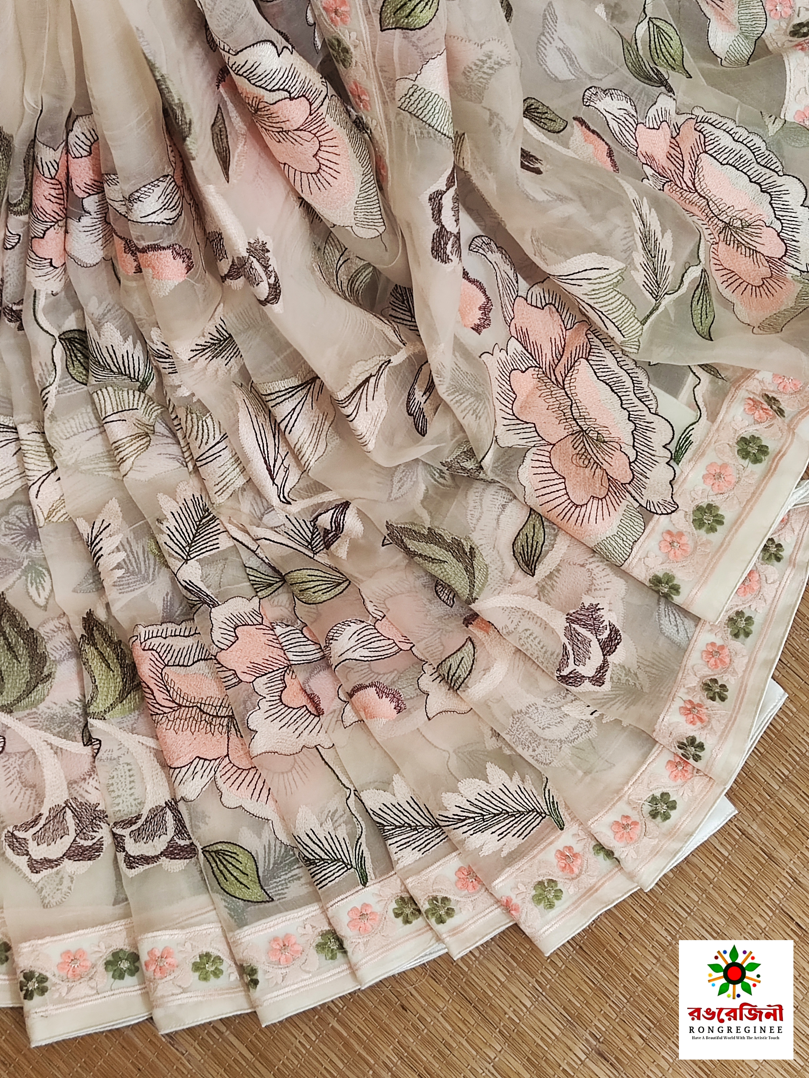 Buy handcrafted silk saree online from Rongregeni. Beautiful pastel golden floral embroidery, soft silk texture and timeless Bangladeshi craftsmanship. perfect for any occasion.