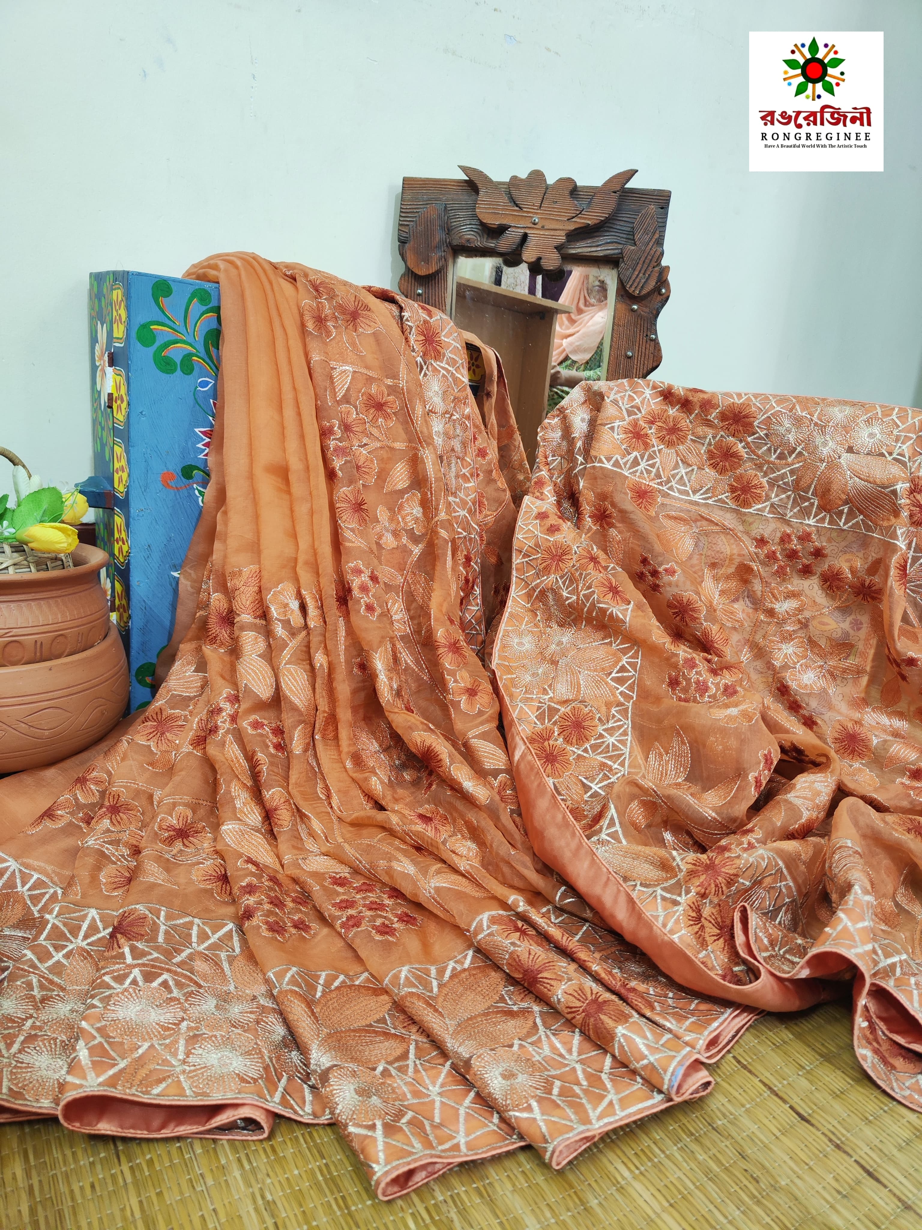 This handcrafted silk saree blends classic elegance with modern charm. woven in a warm orange-gold hue, the saree features delicate hand embroidery shaped into floral motifs across the body and refined geometric stitching along the border. The result is a subtle, textured look that catches light beautifully without overpowering the silhouette.